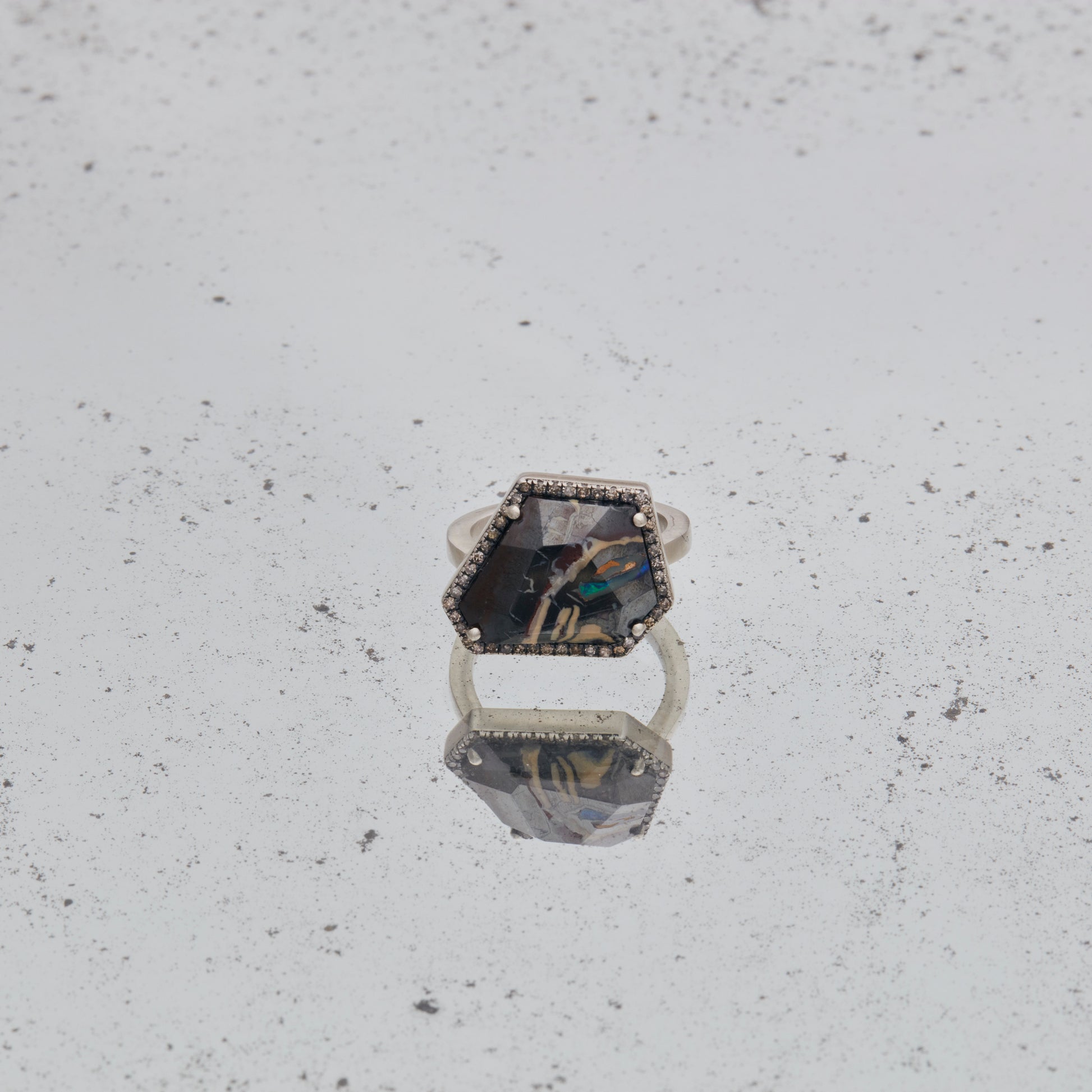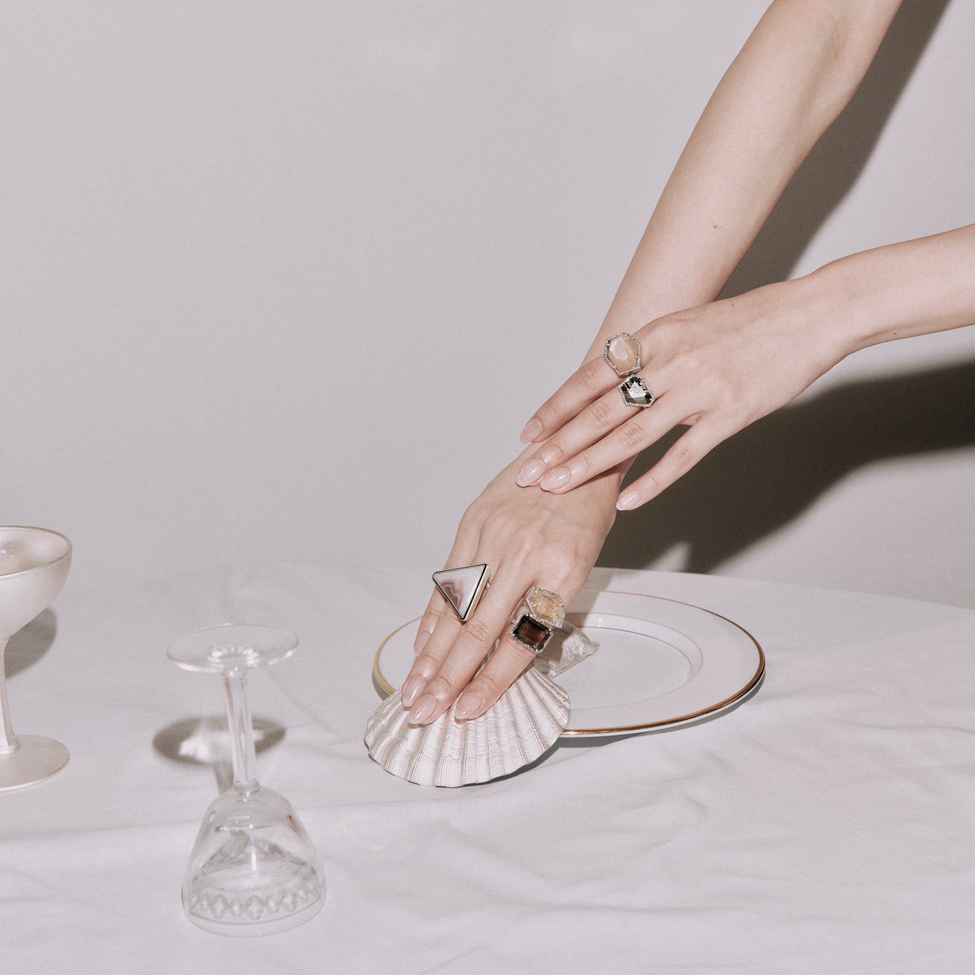 The dead stock stone that has been sleeping for many years is cut into a modern shape by craftsmen in Japan. Surrounded by pave diamonds and oxidized on the nails to give it a vintage look. Shaped it into a rounded volume-shaped ring, Recycled silver 925 is used for the bullion, leaving a soft luster on the matte finish.