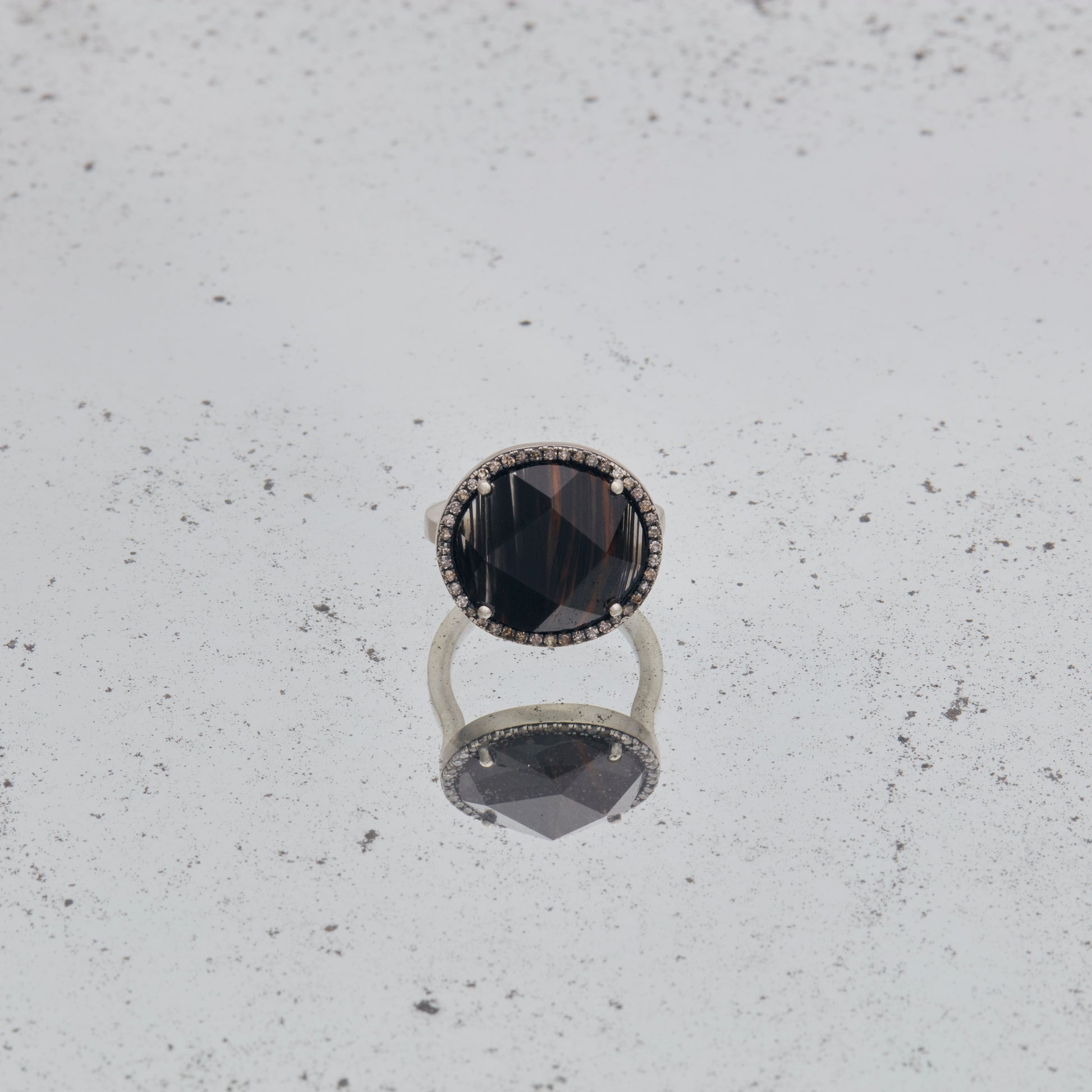 The dead stock stone that has been sleeping for many years is cut into a modern shape by craftsmen in Japan. Surrounded by pave diamonds and oxidized on the nails to give it a vintage look. Shaped it into a rounded volume-shaped ring, Recycled silver 925 is used for the bullion, leaving a soft luster on the matte finish.
