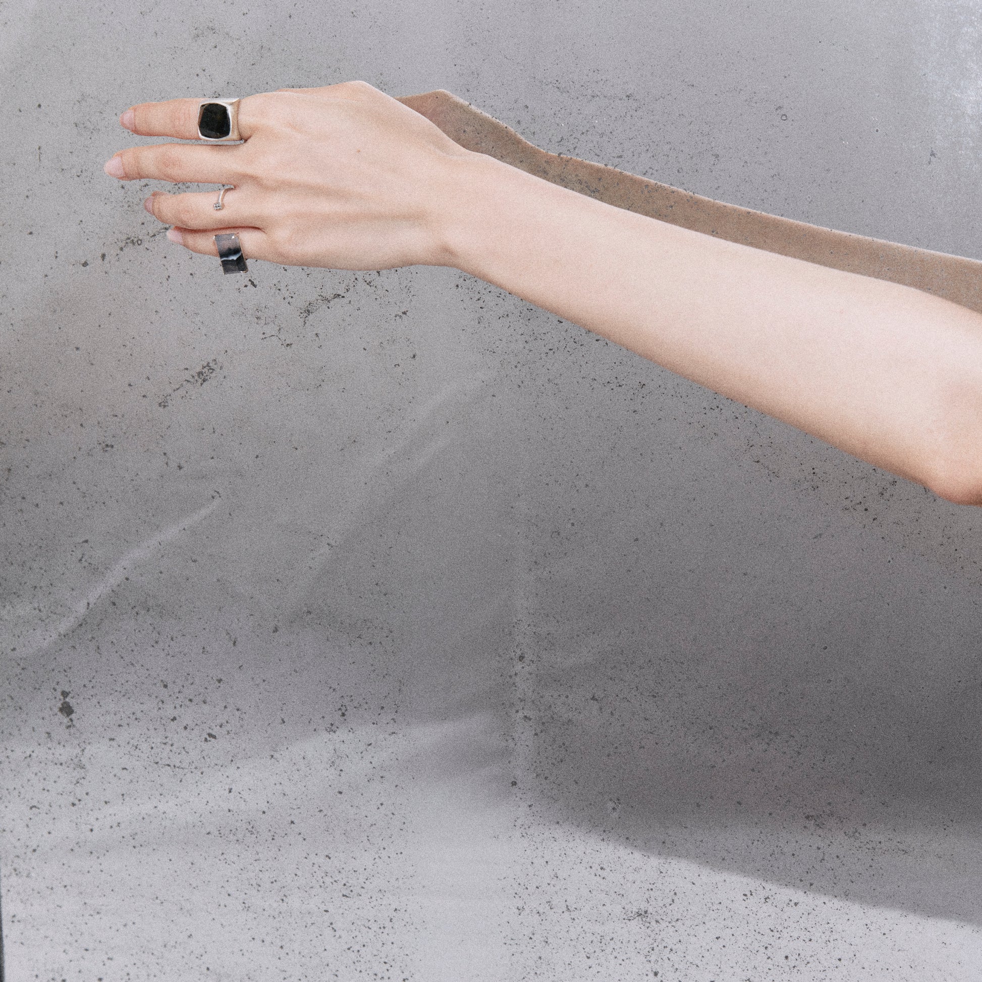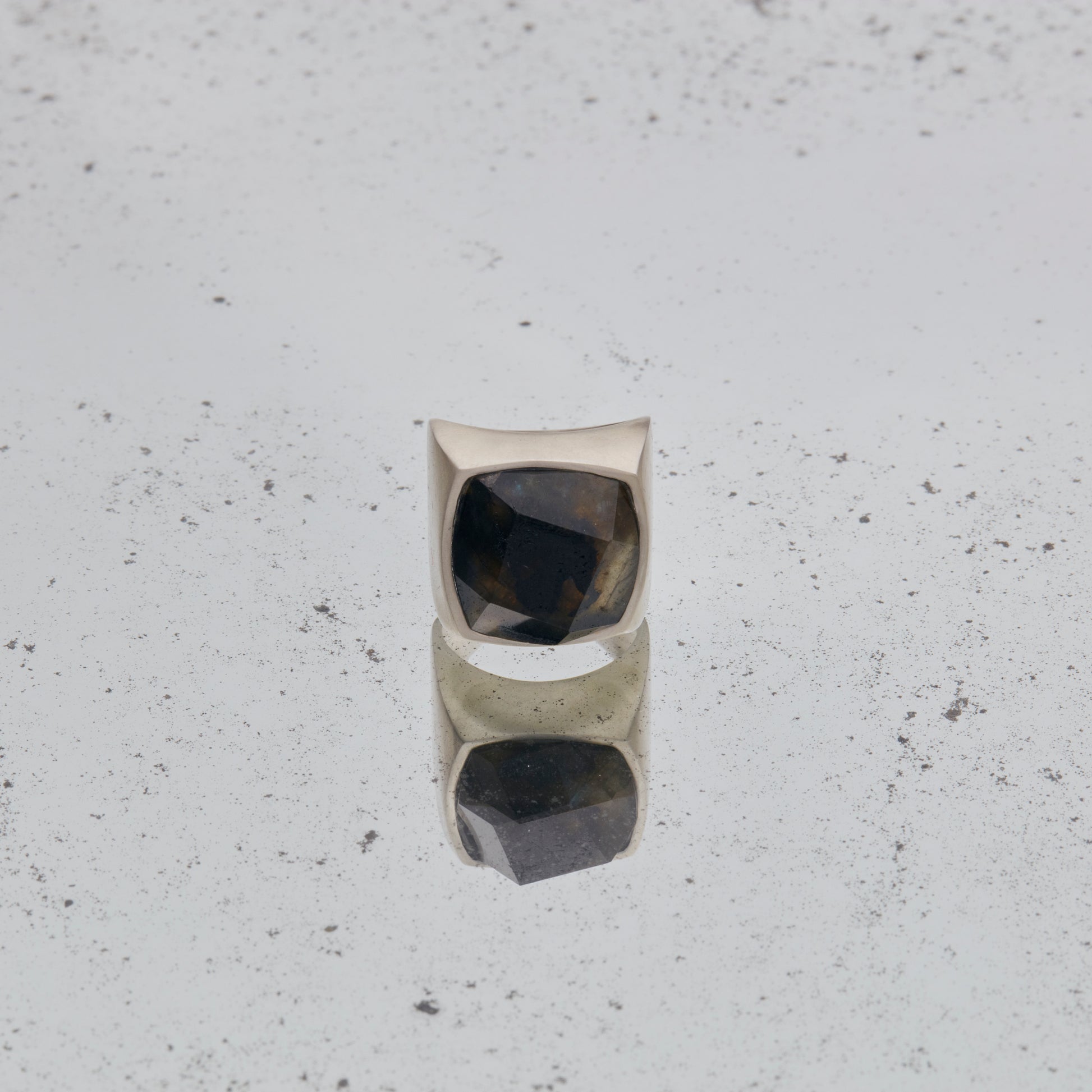 The dead stock stone that has been sleeping for many years is cut into a modern shape by craftsmen in Japan. Surrounded by pave diamonds and oxidized on the nails to give it a vintage look. Shaped it into a rounded volume-shaped ring, Recycled silver 925 is used for the bullion, leaving a soft luster on the matte finish.