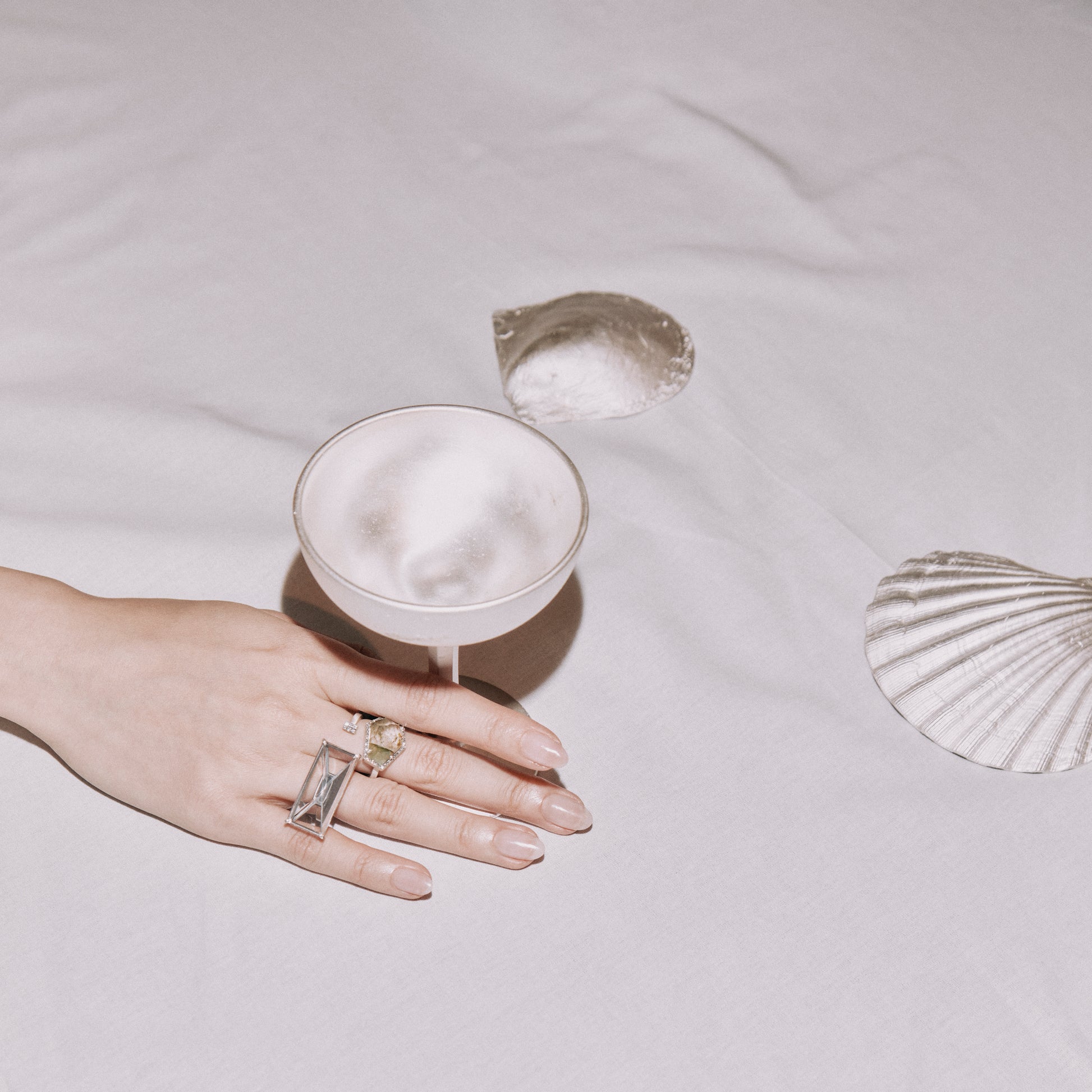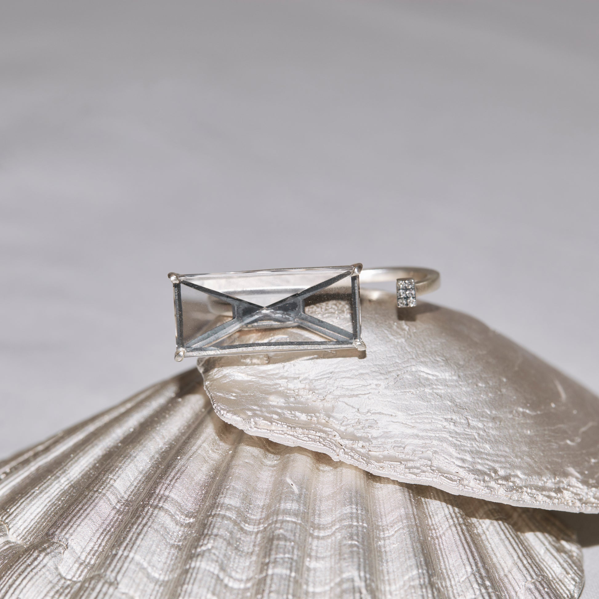 The dead stock stone that has been sleeping for many years is cut into a modern shape by craftsmen in Japan. Surrounded by pave diamonds and oxidized on the nails to give it a vintage look. Shaped it into a rounded volume-shaped ring, Recycled silver 925 is used for the bullion, leaving a soft luster on the matte finish.