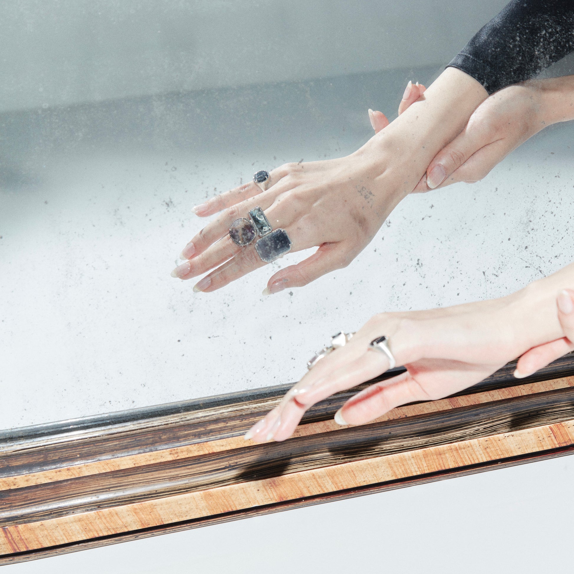 The dead stock stone that has been sleeping for many years is cut into a modern shape by craftsmen in Japan. Surrounded by pave diamonds and oxidized on the nails to give it a vintage look. Shaped it into a rounded volume-shaped ring, Recycled silver 925 is used for the bullion, leaving a soft luster on the matte finish.