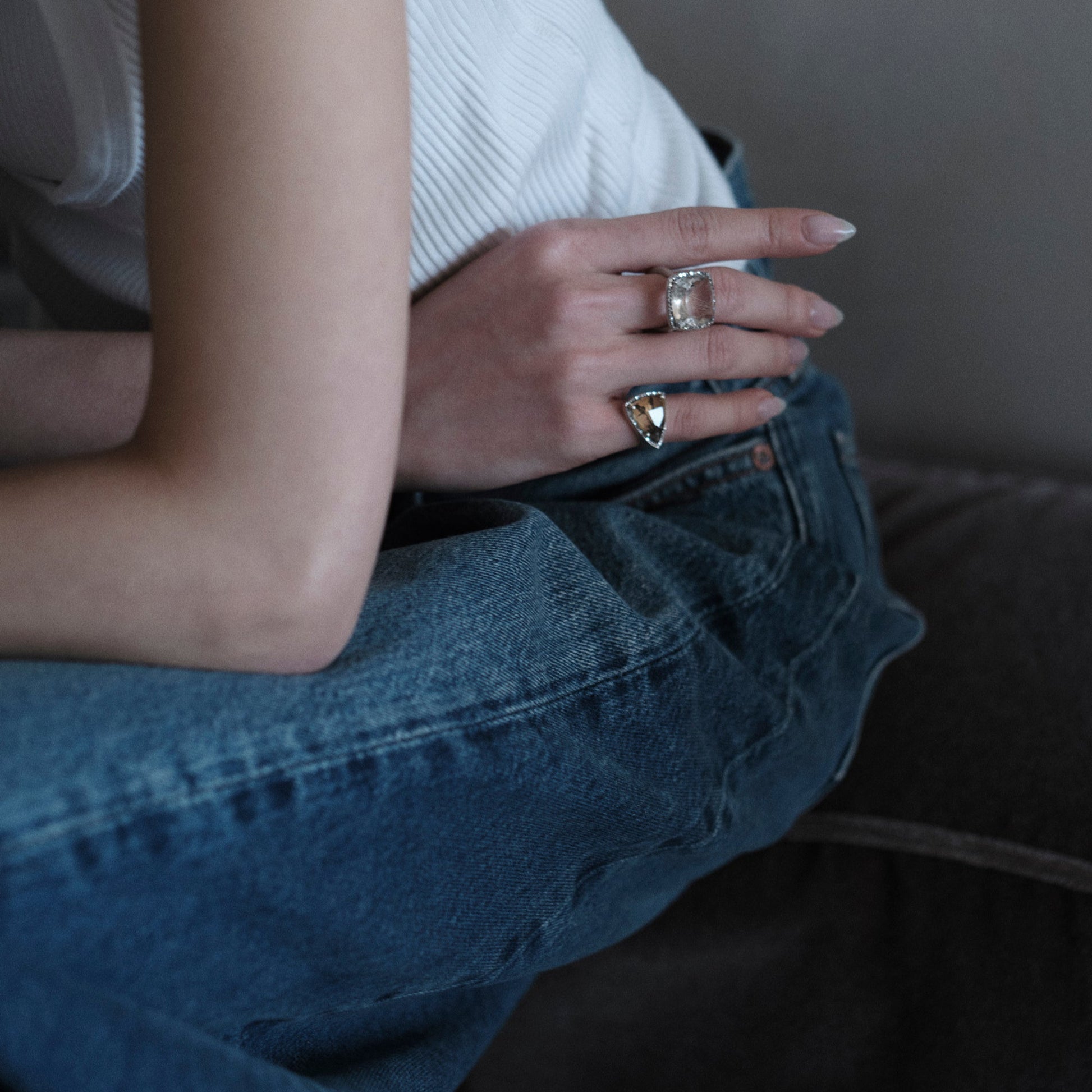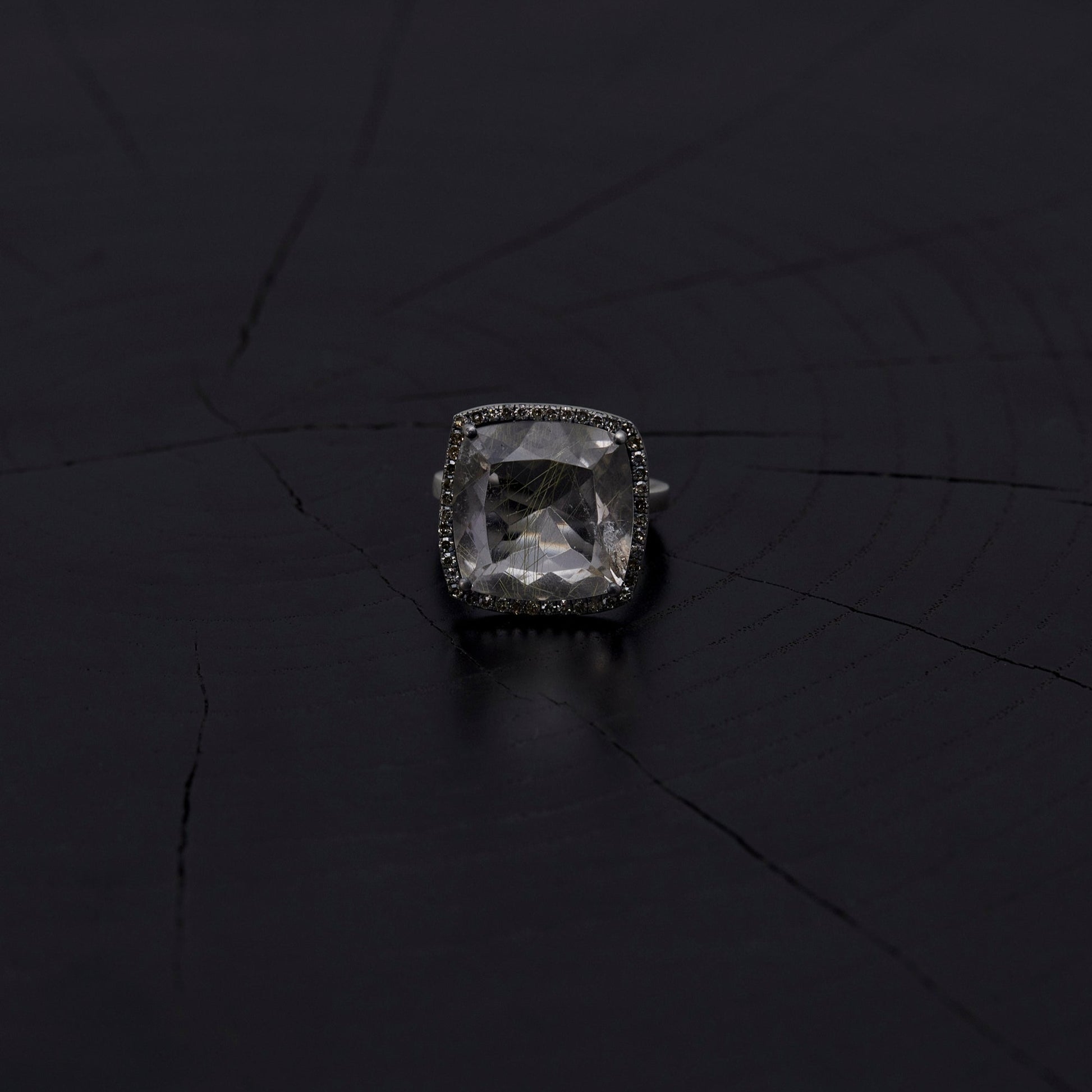 A deadstock stone that had been lying dormant for many years was polished by a craftsman in Japan into a modern cut. It is surrounded by pave brown diamonds and the prongs are oxidized to give it a vintage look. It is shaped into a sharp, square wire ring. The base metal is recycled Silver 925, with a matte finish that leaves a soft luster.