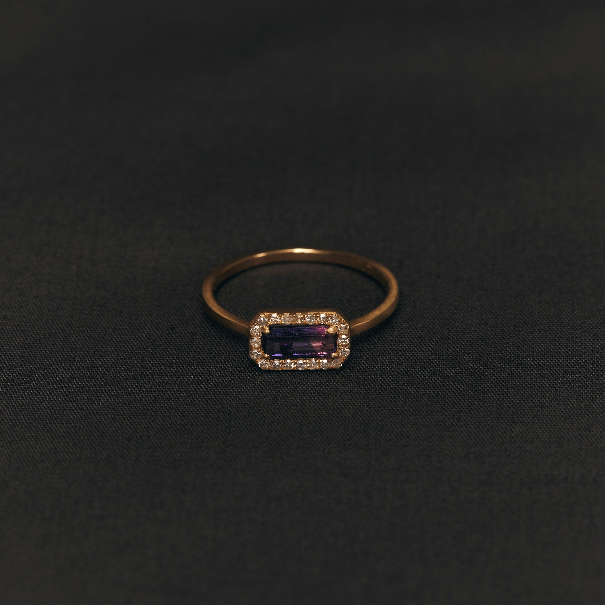 A rare Windsor sapphire is surrounded by pavé diamonds and set in a delicate 18K yellow gold ring. This is a one-of-a-kind piece.