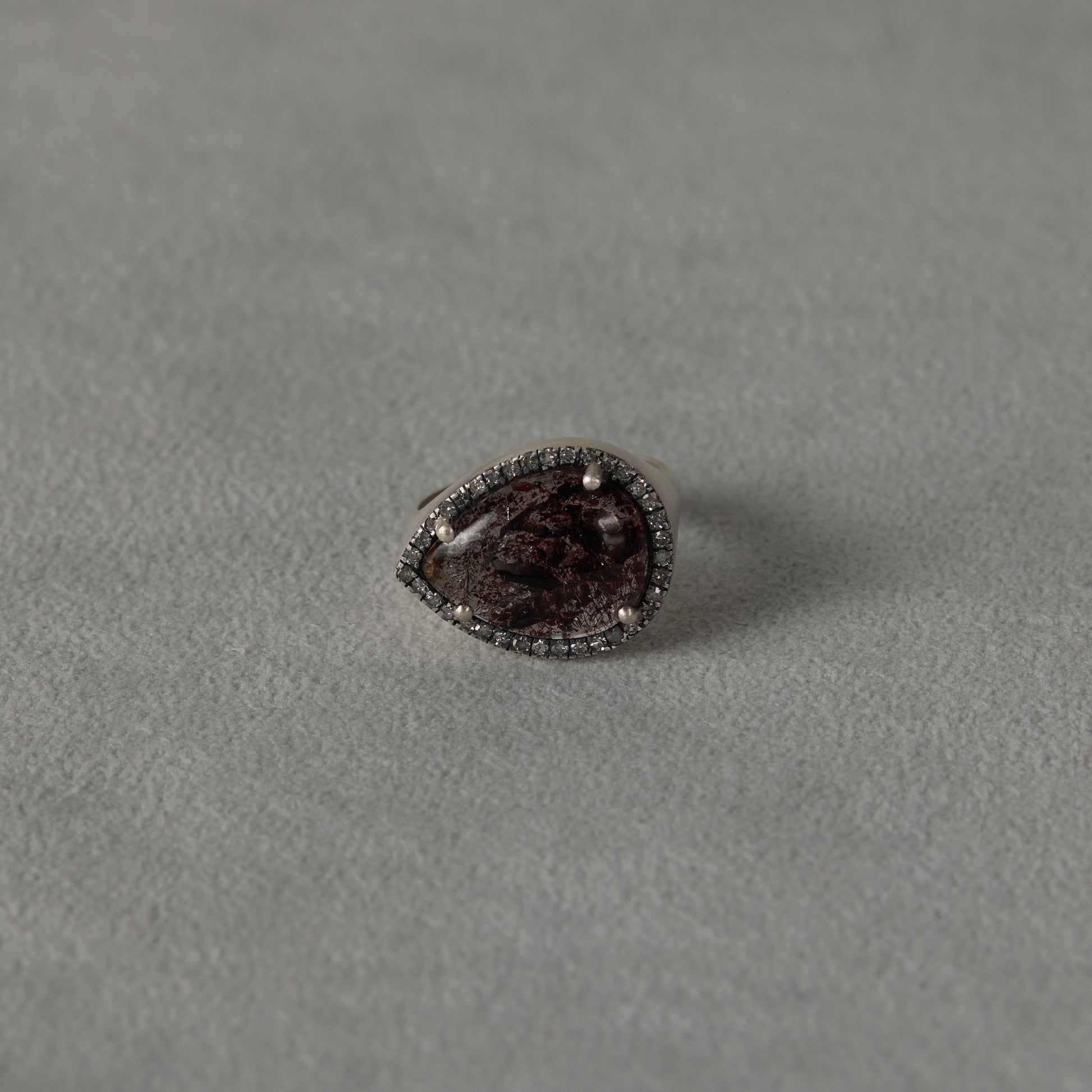 長年眠っていたデッドストックのストーンを、日本国内の職人の手によりモダンなカットに擦り上げました。パヴェダイヤモンドで取り巻き、爪部分にオキシダイズド加工をほどこすことでヴィンテージピースのような風合いに。丸みを帯びたボリュームシェイプのピンキーリングに成形しました。地金はリサイクルされたSilver925を使用、マットフィニッシュに柔らかな光沢を残しました。一点ものとなります。