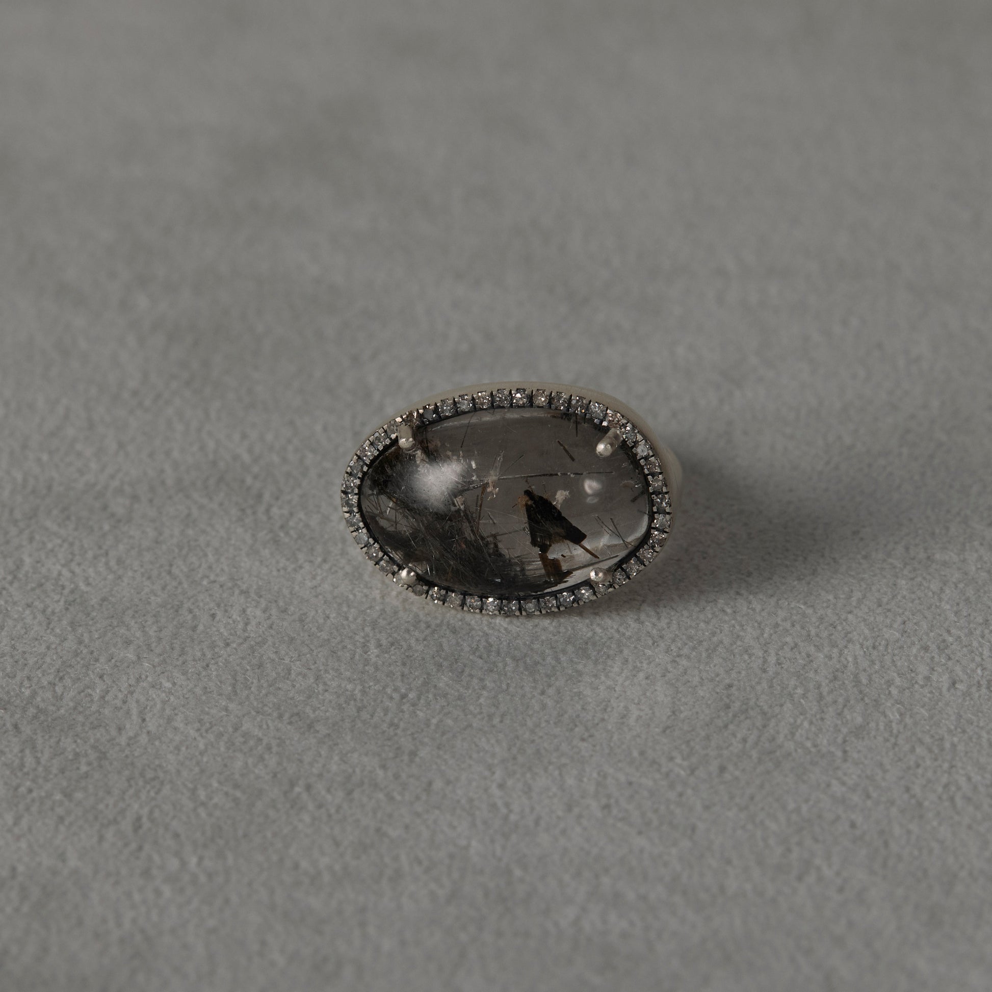 長年眠っていたデッドストックのストーンを、日本国内の職人の手によりモダンなカットに擦り上げました。パヴェダイヤモンドで取り巻き、爪部分にオキシダイズド加工をほどこすことでヴィンテージピースのような風合いに。丸みを帯びたボリュームシェイプのリングに成形しました。地金はリサイクルされたSilver925を使用、マットフィニッシュに柔らかな光沢を残しました。一点ものとなります。