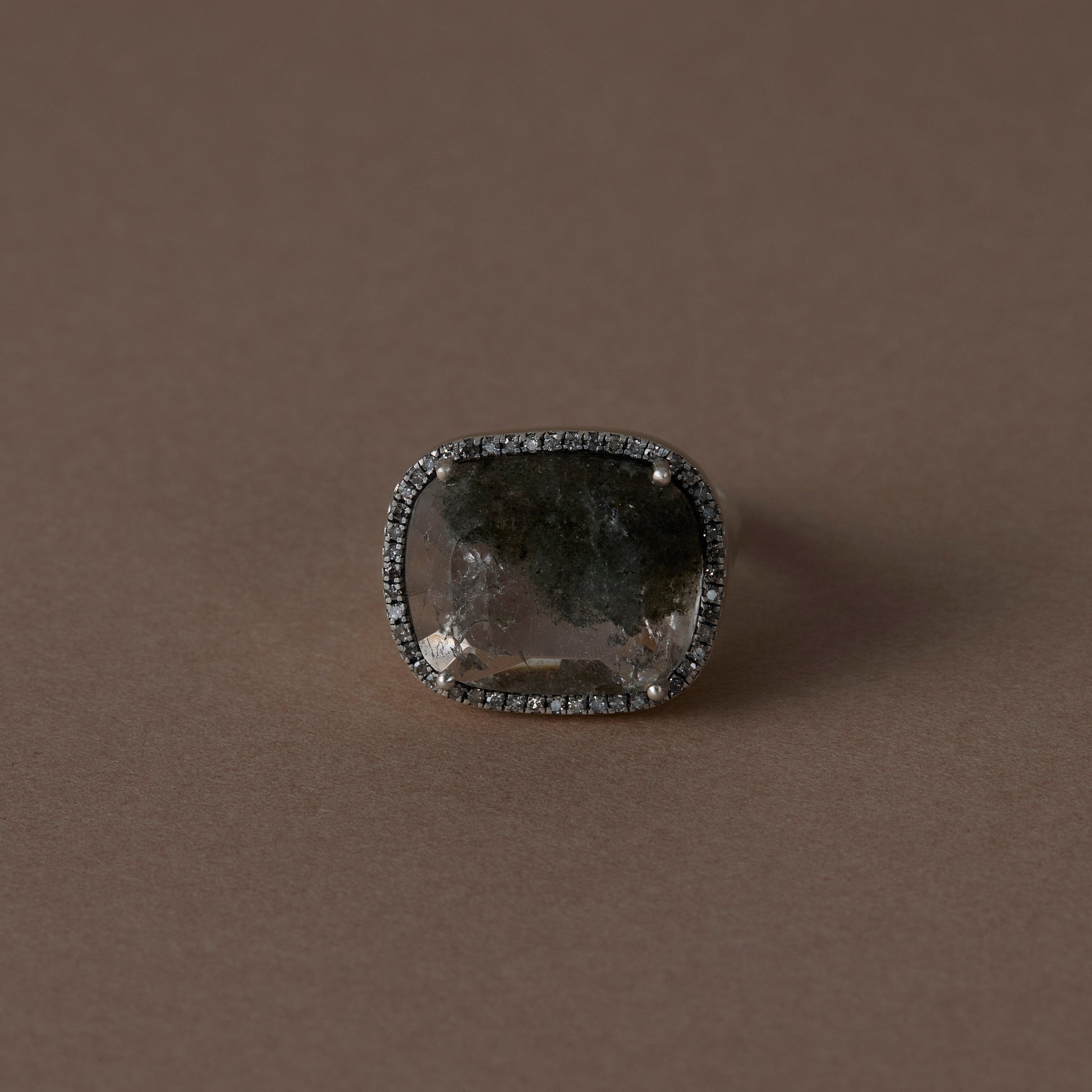 長年眠っていたデッドストックのストーンを、日本国内の職人の手によりモダンなカットに擦り上げました。パヴェダイヤモンドで取り巻き、爪部分にオキシダイズド加工をほどこすことでヴィンテージピースのような風合いに。丸みを帯びたボリュームシェイプのリングに成形しました。地金はリサイクルされたSilver925を使用、マットフィニッシュに柔らかな光沢を残しました。一点ものとなります。