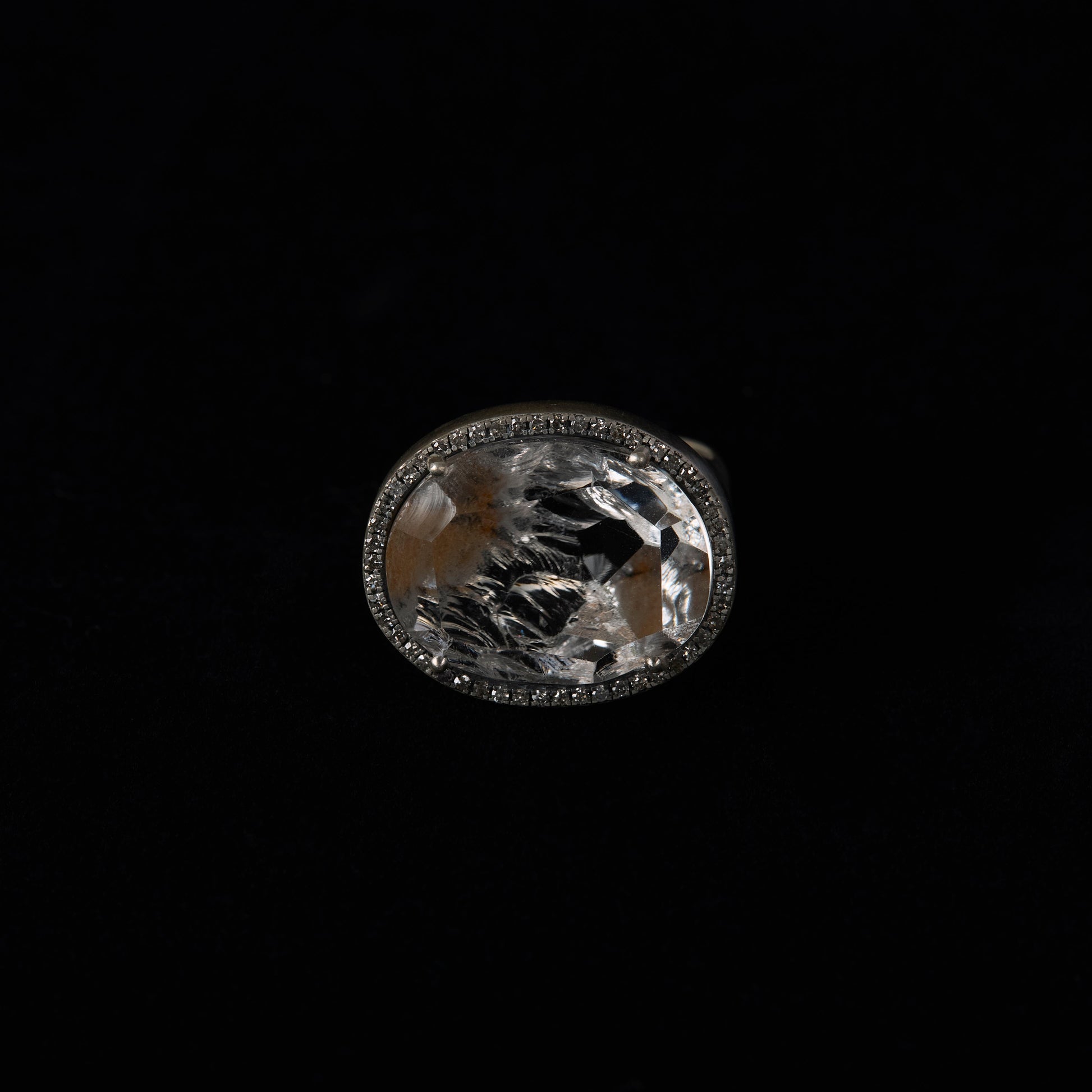 長年眠っていたデッドストックのストーンを、日本国内の職人の手によりモダンなカットに擦り上げました。パヴェダイヤモンドで取り巻き、爪部分にオキシダイズド加工をほどこすことでヴィンテージピースのような風合いに。丸みを帯びたボリュームシェイプのリングに成形しました。地金はリサイクルされたSilver925を使用、マットフィニッシュに柔らかな光沢を残しました。一点ものとなります。