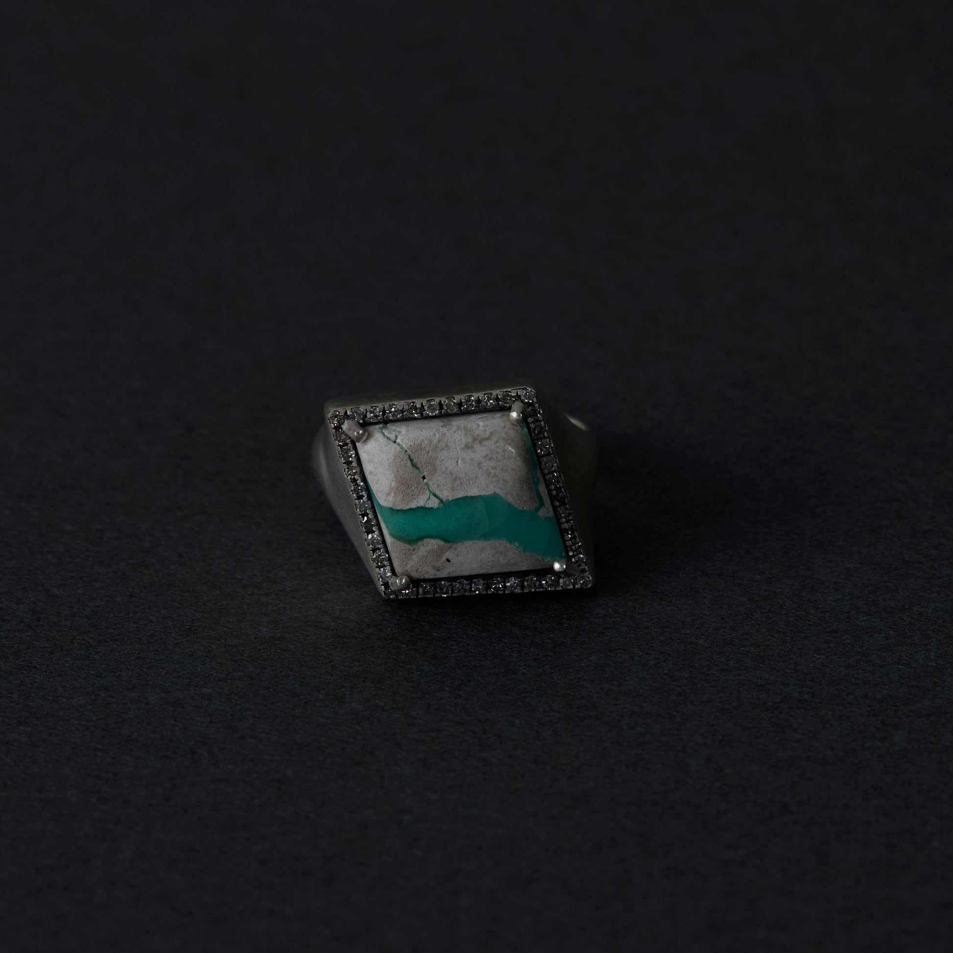 長年眠っていたデッドストックのストーンを、日本国内の職人の手によりモダンなカットに擦り上げました。パヴェダイヤモンドで取り巻き、爪部分にオキシダイズド加工をほどこすことでヴィンテージピースのような風合いに。丸みを帯びたボリュームシェイプのリングに成形しました。地金はリサイクルされたSilver925を使用、マットフィニッシュに柔らかな光沢を残しました。一点ものとなります。