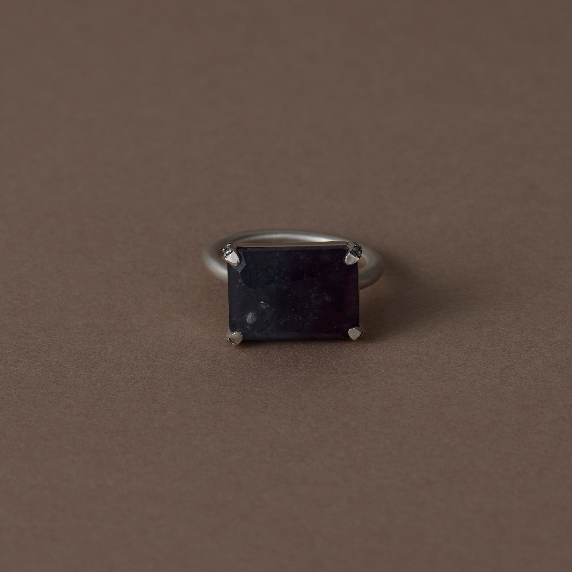 長年眠っていたデッドストックのストーンを、日本国内の職人の手によりモダンなカットに擦り上げました。4本の爪にメレダイヤモンドを数粒ずつ添え、丸みを帯びたアームに成形したリング。地金はリサイクルされたSilver925を使用、マットフィニッシュに柔らかな光沢を残しました。一点ものとなります。