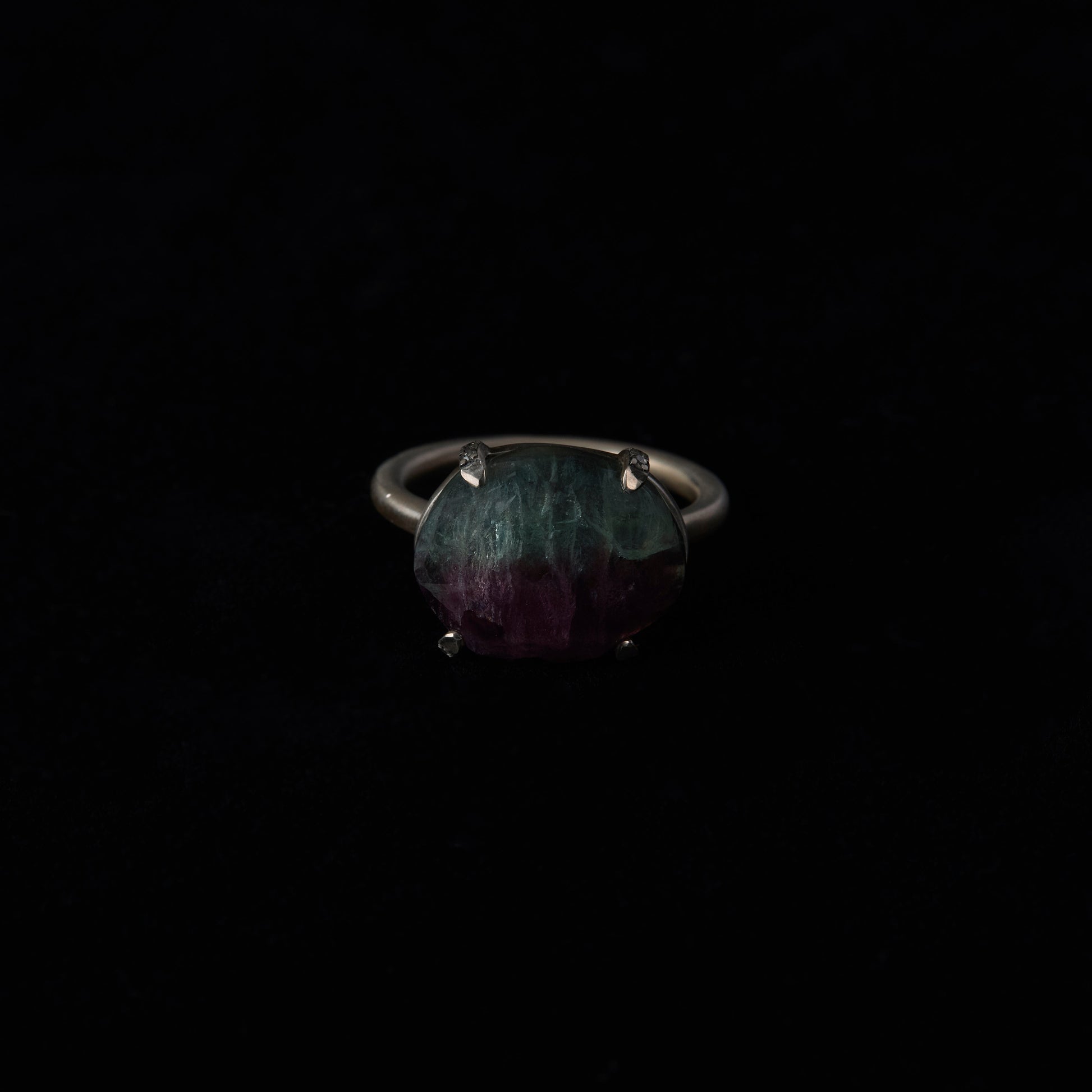 長年眠っていたデッドストックのストーンを、日本国内の職人の手によりモダンなカットに擦り上げました。4本の爪にメレダイヤモンドを数粒ずつ添え、丸みを帯びたアームに成形したリング。地金はリサイクルされたSilver925を使用、マットフィニッシュに柔らかな光沢を残しました。一点ものとなります。