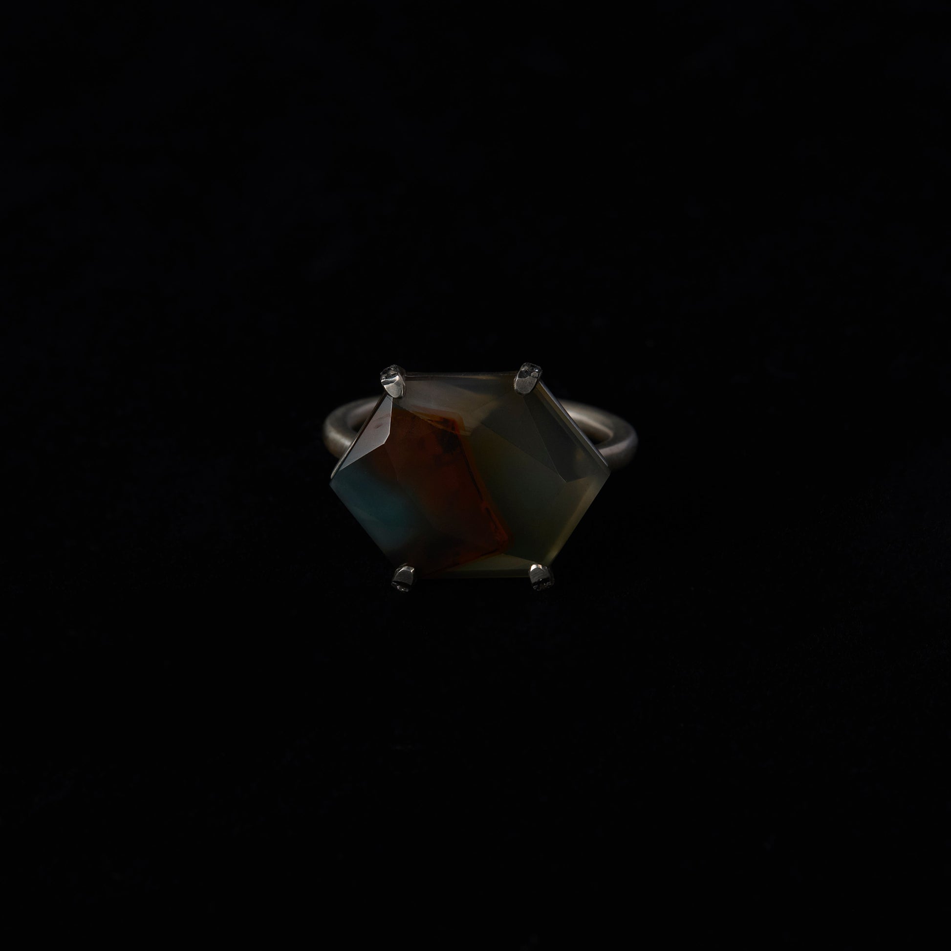 長年眠っていたデッドストックのストーンを、日本国内の職人の手によりモダンなカットに擦り上げました。4本の爪にメレダイヤモンドを数粒ずつ添え、丸みを帯びたアームに成形したリング。地金はリサイクルされたSilver925を使用、マットフィニッシュに柔らかな光沢を残しました。一点ものとなります。