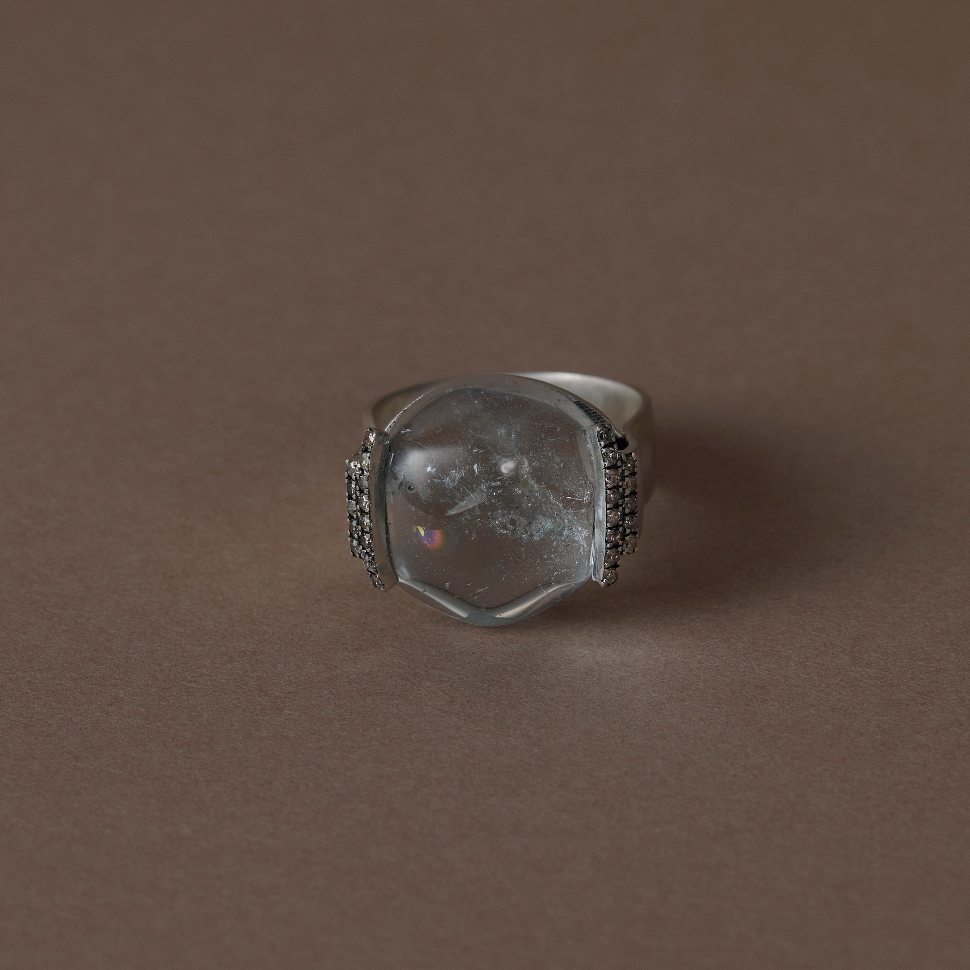 長年眠っていたデッドストックのストーンを、日本国内の職人の手によりモダンなカットに擦り上げました。サイド2本ずつのバーにパヴェダイヤモンドをあしらい、爪部分にオキシダイズド加工をほどこすことでヴィンテージピースのような風合いに。厚みを抑えたワイドバンドリングに成形しました。地金はリサイクルされたSilver925を使用、マットフィニッシュに柔らかな光沢を残しました。一点ものとなります。