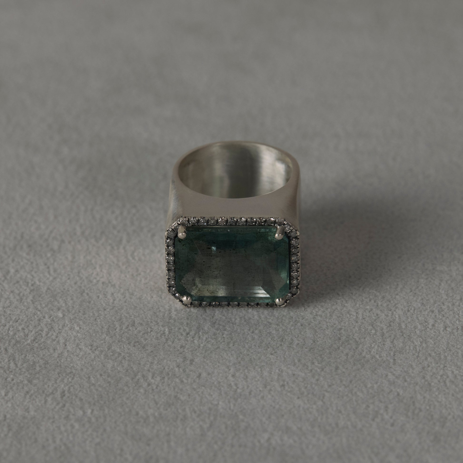 長年眠っていたデッドストックのストーンを、日本国内の職人の手によりモダンなカットに擦り上げました。パヴェダイヤモンドで取り巻き、爪部分にオキシダイズド加工をほどこすことでヴィンテージピースのような風合いに。ボリュームのあるワイドバンドリングに成形しました。地金はリサイクルされたSilver925を使用、マットフィニッシュに柔らかな光沢を残しました。一点ものとなります。