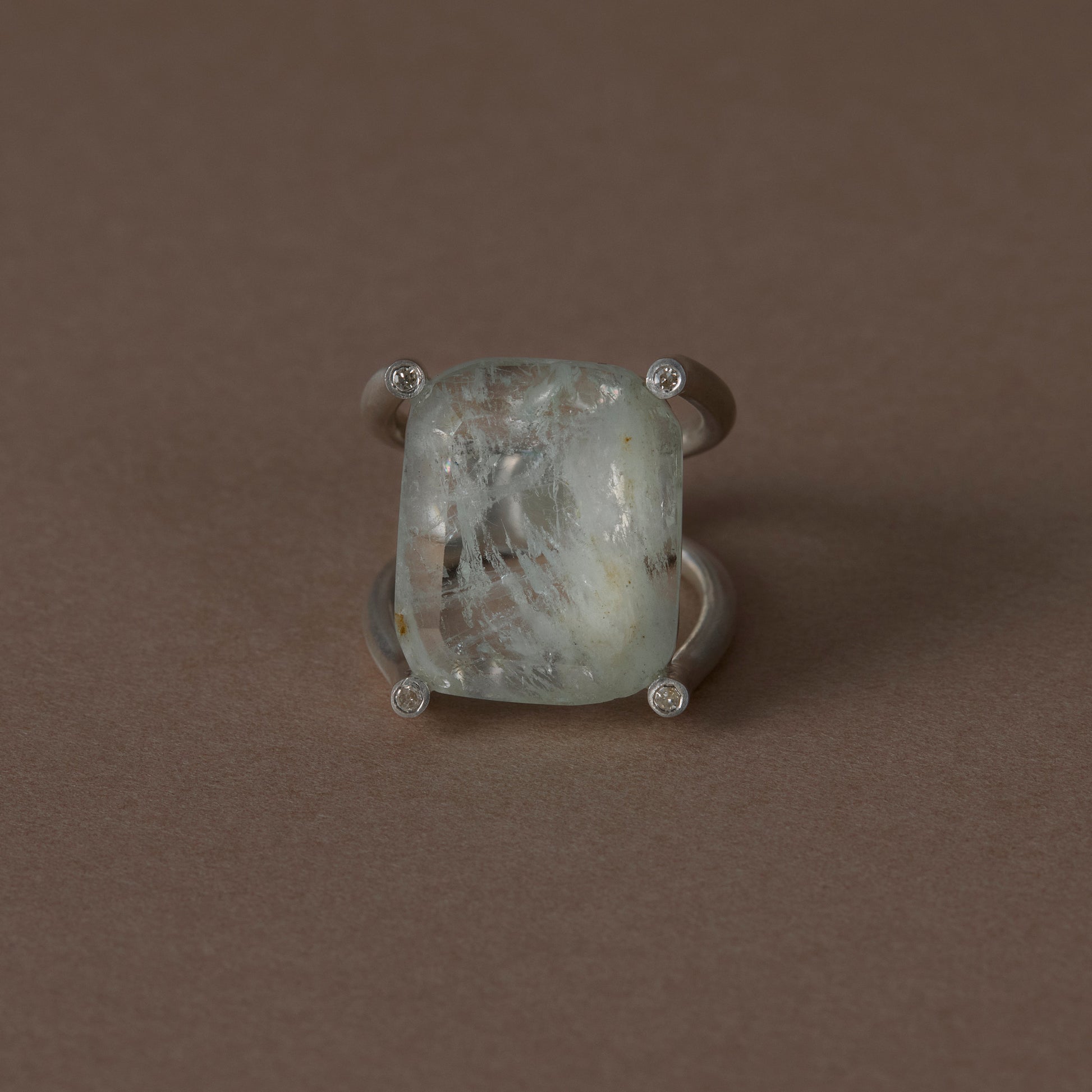 長年眠っていたデッドストックのストーンを、日本国内の職人の手によりモダンなカットに擦り上げました。曲線を描く4本のアームの先に大粒のダイヤモンドを添えたリング。 地金はリサイクルされたSilver925を使用、マットフィニッシュに柔らかな光沢を残しました。一点ものとなります。