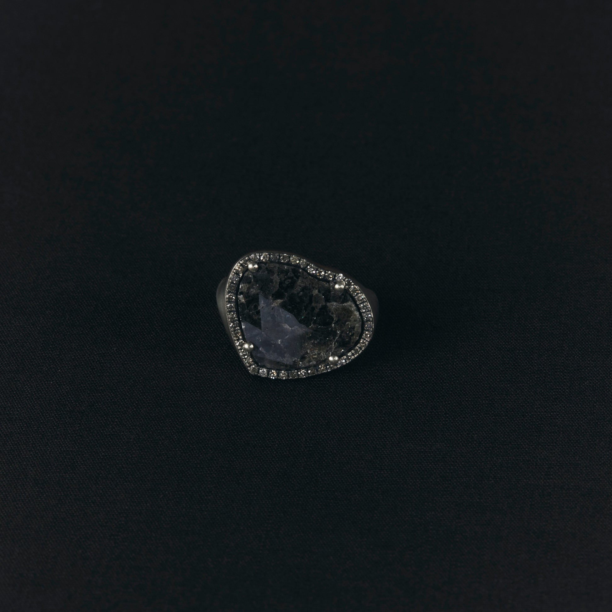 長年眠っていたデッドストックのストーンを、日本国内の職人の手によりモダンなカットに擦り上げました。パヴェダイヤモンドで取り巻き、爪部分にオキシダイズド加工をほどこすことでヴィンテージピースのような風合いに。丸みを帯びたボリュームシェイプのリングに成形しました。地金はリサイクルされたSilver925を使用、マットフィニッシュに柔らかな光沢を残しました。一点ものとなります。