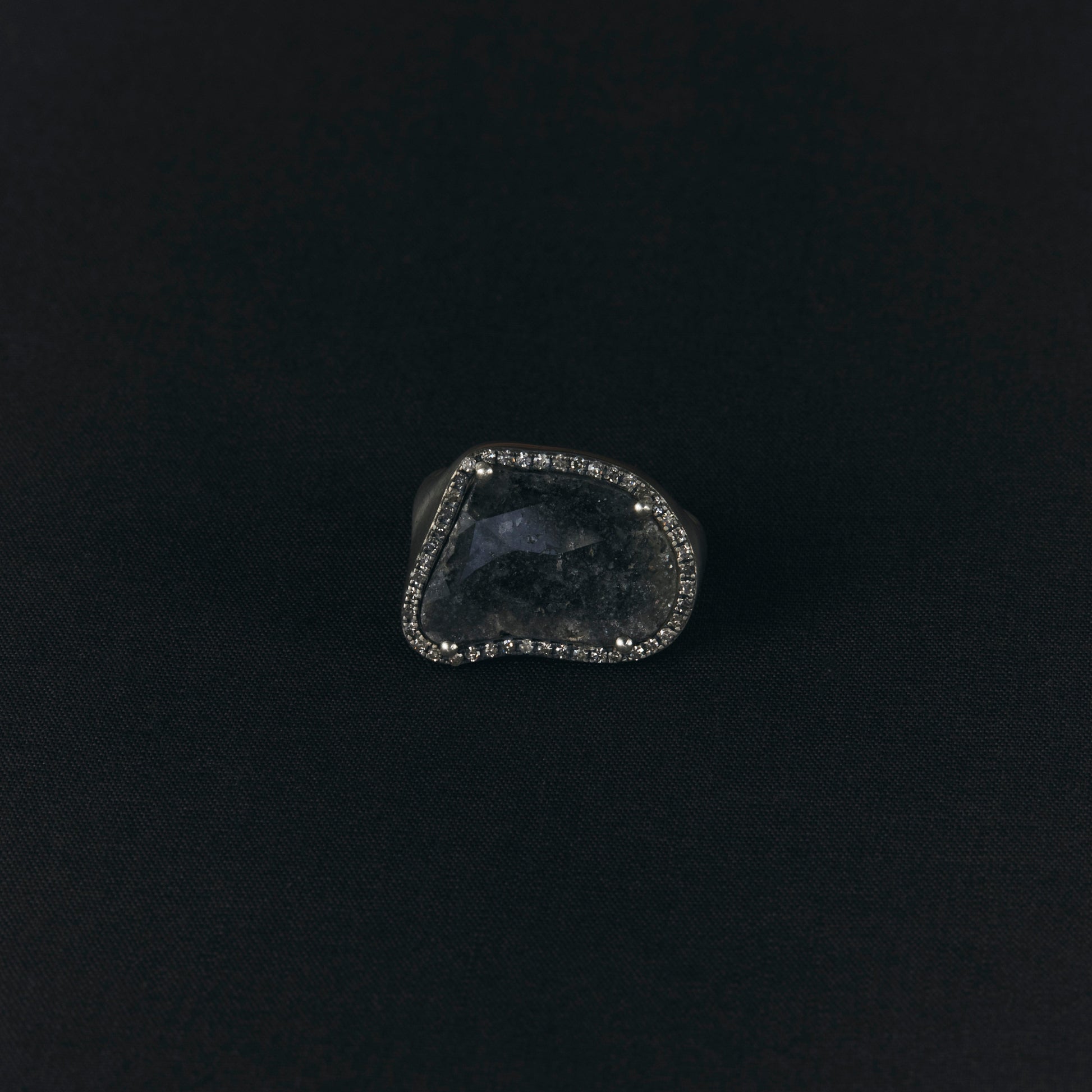 長年眠っていたデッドストックのストーンを、日本国内の職人の手によりモダンなカットに擦り上げました。パヴェダイヤモンドで取り巻き、爪部分にオキシダイズド加工をほどこすことでヴィンテージピースのような風合いに。丸みを帯びたボリュームシェイプのリングに成形しました。地金はリサイクルされたSilver925を使用、マットフィニッシュに柔らかな光沢を残しました。一点ものとなります。