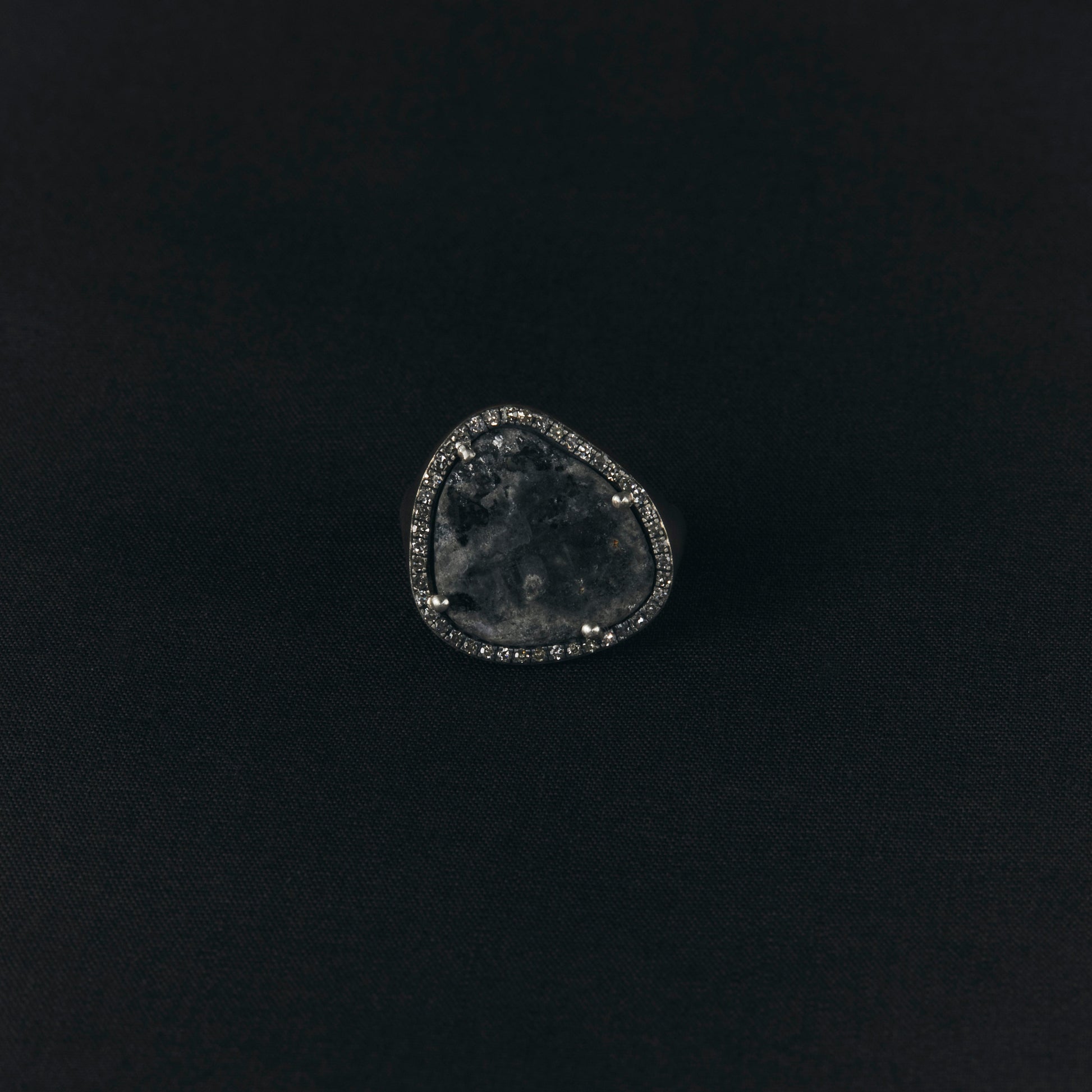 長年眠っていたデッドストックのストーンを、日本国内の職人の手によりモダンなカットに擦り上げました。パヴェダイヤモンドで取り巻き、爪部分にオキシダイズド加工をほどこすことでヴィンテージピースのような風合いに。丸みを帯びたボリュームシェイプのリングに成形しました。地金はリサイクルされたSilver925を使用、マットフィニッシュに柔らかな光沢を残しました。一点ものとなります。