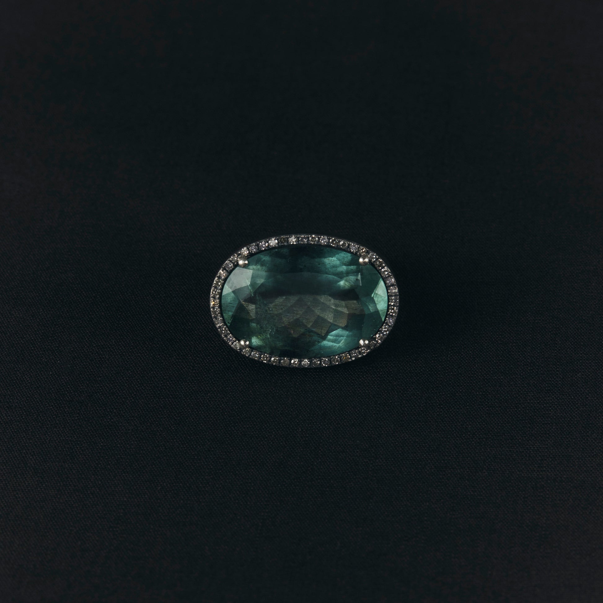 長年眠っていたデッドストックのストーンを、日本国内の職人の手によりモダンなカットに擦り上げました。パヴェダイヤモンドで取り巻き、爪部分にオキシダイズド加工をほどこすことでヴィンテージピースのような風合いに。丸みを帯びたボリュームシェイプのリングに成形しました。地金はリサイクルされたSilver925を使用、マットフィニッシュに柔らかな光沢を残しました。一点ものとなります。