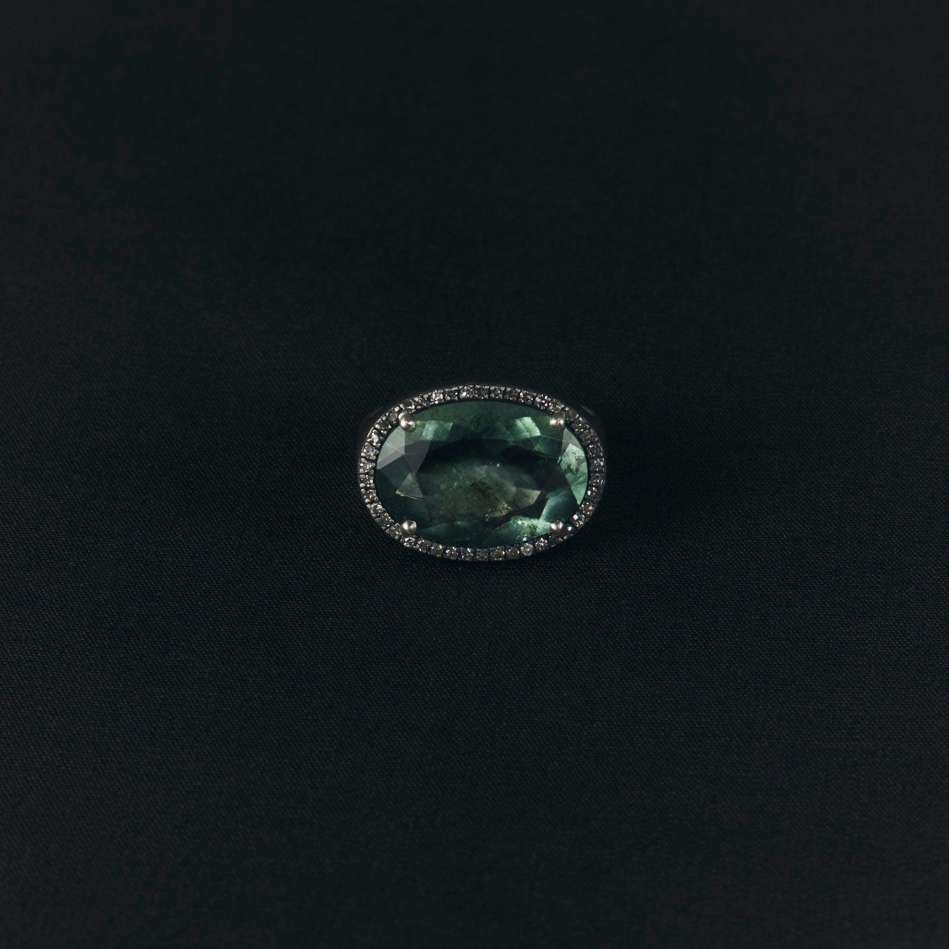 長年眠っていたデッドストックのストーンを、日本国内の職人の手によりモダンなカットに擦り上げました。パヴェダイヤモンドで取り巻き、爪部分にオキシダイズド加工をほどこすことでヴィンテージピースのような風合いに。丸みを帯びたボリュームシェイプのリングに成形しました。地金はリサイクルされたSilver925を使用、マットフィニッシュに柔らかな光沢を残しました。一点ものとなります。