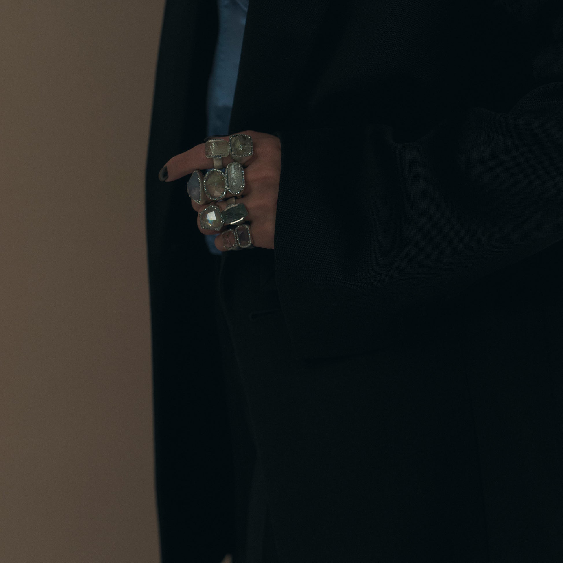 長年眠っていたデッドストックのストーンを、日本国内の職人の手によりモダンなカットに擦り上げました。パヴェダイヤモンドで取り巻き、爪部分にオキシダイズド加工をほどこすことでヴィンテージピースのような風合いに。丸みを帯びたボリュームシェイプのリングに成形しました。地金はリサイクルされたSilver925を使用、マットフィニッシュに柔らかな光沢を残しました。一点ものとなります。