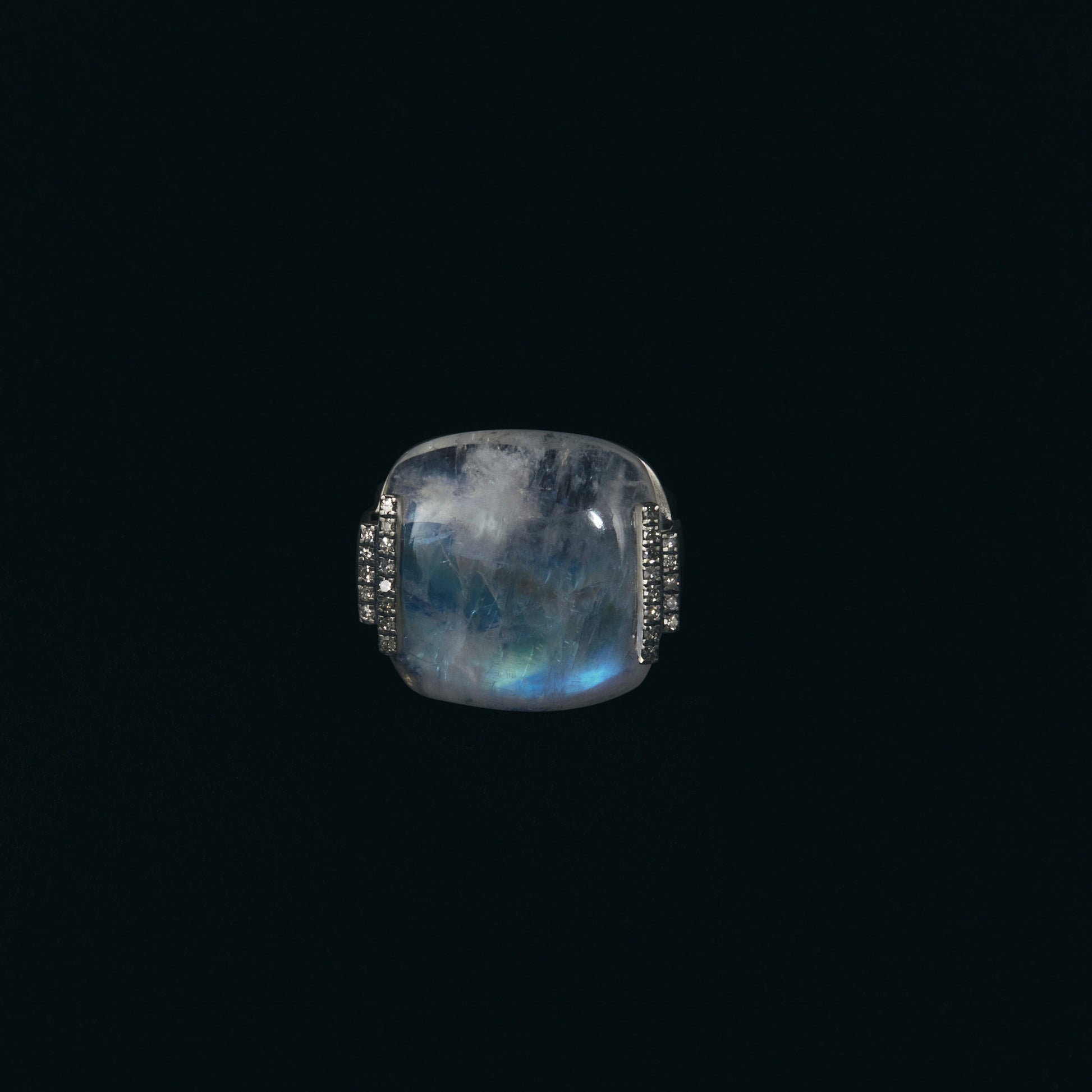 長年眠っていたデッドストックのストーンを、日本国内の職人の手によりモダンなカットに擦り上げました。サイド2本ずつのバーにパヴェダイヤモンドをあしらい、爪部分にオキシダイズド加工をほどこすことでヴィンテージピースのような風合いに。厚みを抑えたワイドバンドリングに成形しました。地金はリサイクルされたSilver925を使用、マットフィニッシュに柔らかな光沢を残しました。一点ものとなります。