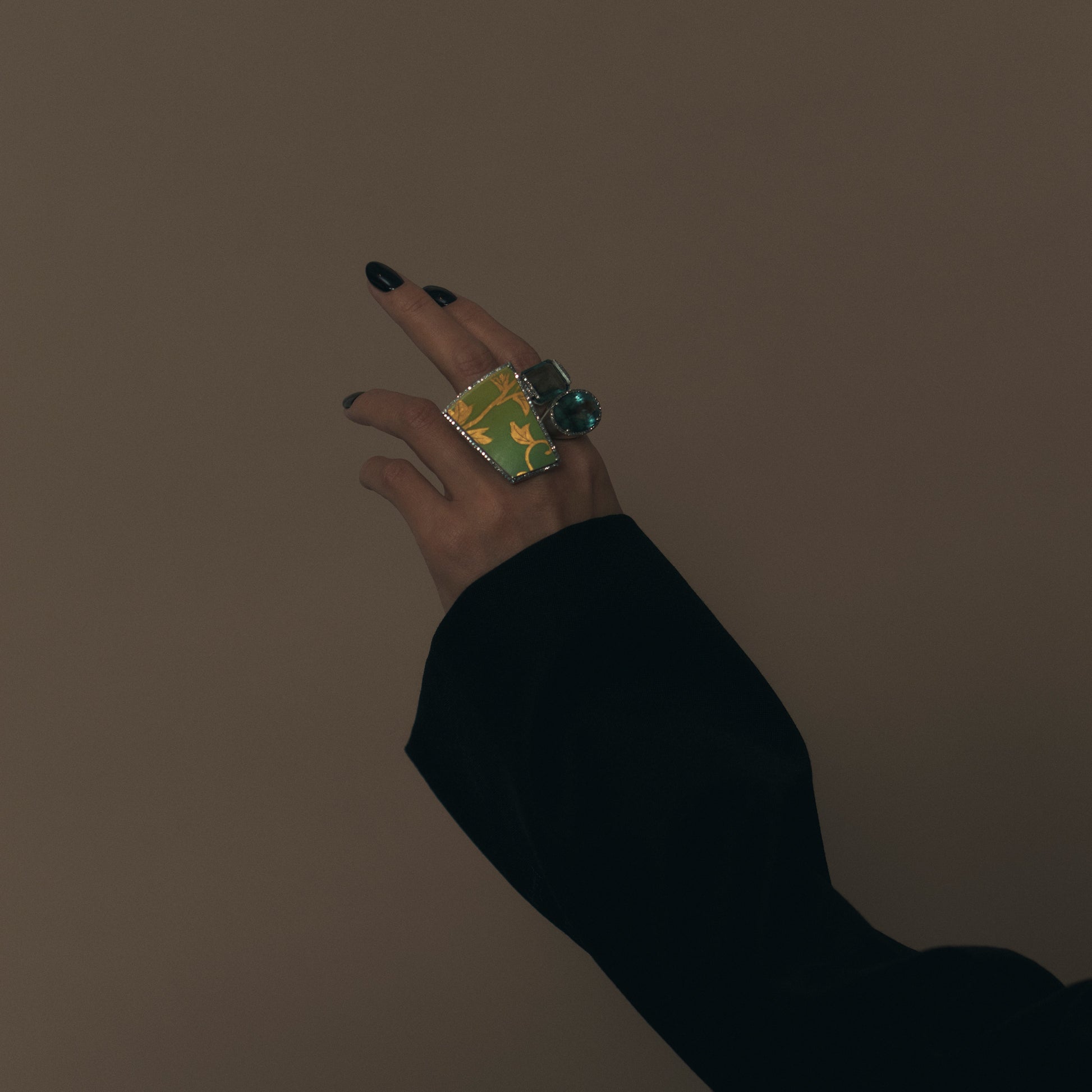 長年眠っていたデッドストックのストーンを、日本国内の職人の手によりモダンなカットに擦り上げました。サイド2本ずつのバーにパヴェダイヤモンドをあしらい、爪部分にオキシダイズド加工をほどこすことでヴィンテージピースのような風合いに。厚みを抑えたワイドバンドリングに成形しました。地金はリサイクルされたSilver925を使用、マットフィニッシュに柔らかな光沢を残しました。一点ものとなります。