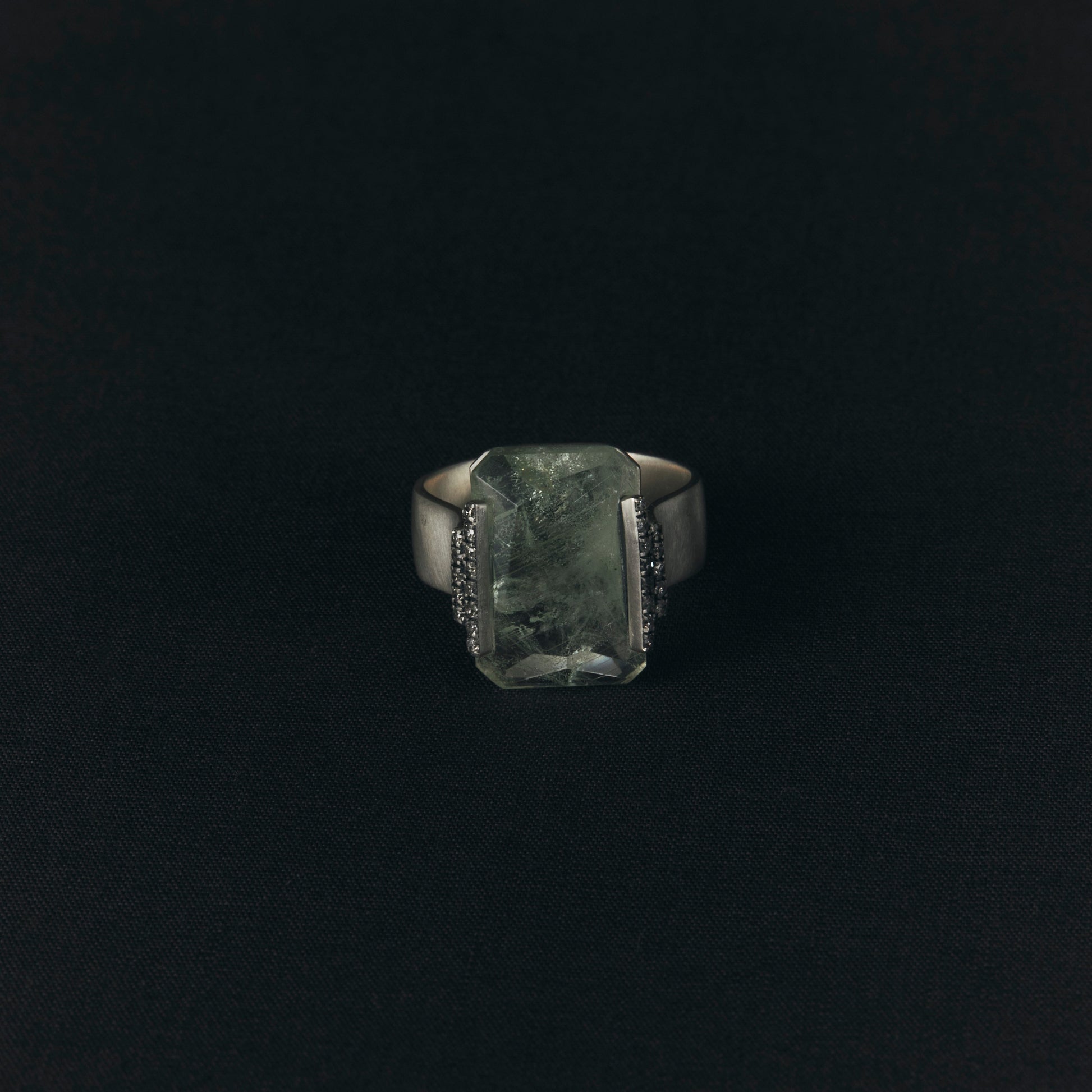 長年眠っていたデッドストックのストーンを、日本国内の職人の手によりモダンなカットに擦り上げました。サイド2本ずつのバーにパヴェダイヤモンドをあしらい、爪部分にオキシダイズド加工をほどこすことでヴィンテージピースのような風合いに。厚みを抑えたワイドバンドリングに成形しました。地金はリサイクルされたSilver925を使用、マットフィニッシュに柔らかな光沢を残しました。一点ものとなります。