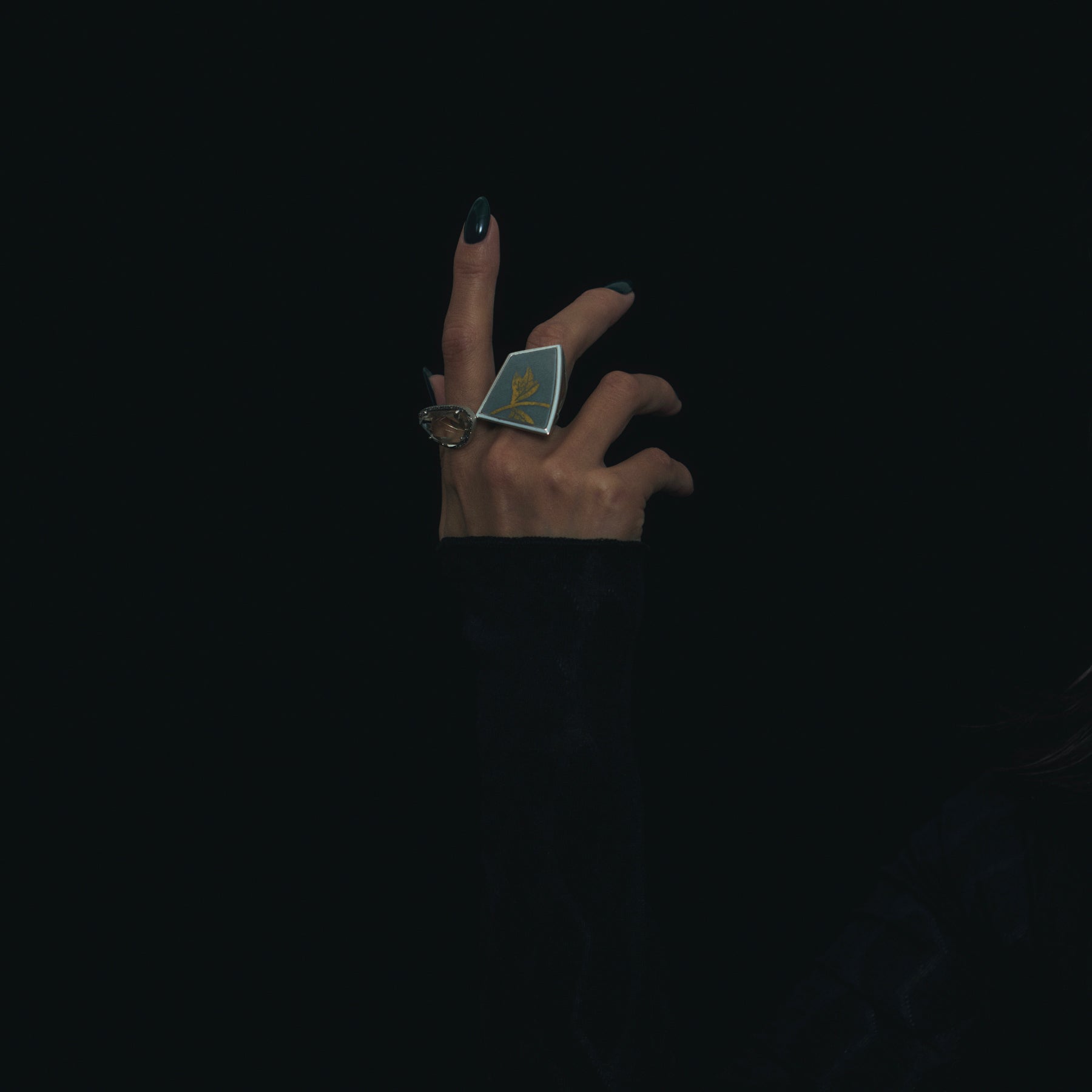 長年眠っていたデッドストックのストーンを、日本国内の職人の手によりモダンなカットに擦り上げました。パヴェのブラウンダイヤモンドで取り巻き、爪部分にオキシダイズド加工をほどこすことでヴィンテージピースのような風合いに。シャープな角線のリングに成形しました。地金はリサイクルされたSilver925を使用、マットフィニッシュに柔らかな光沢を残しました。一点ものとなります。