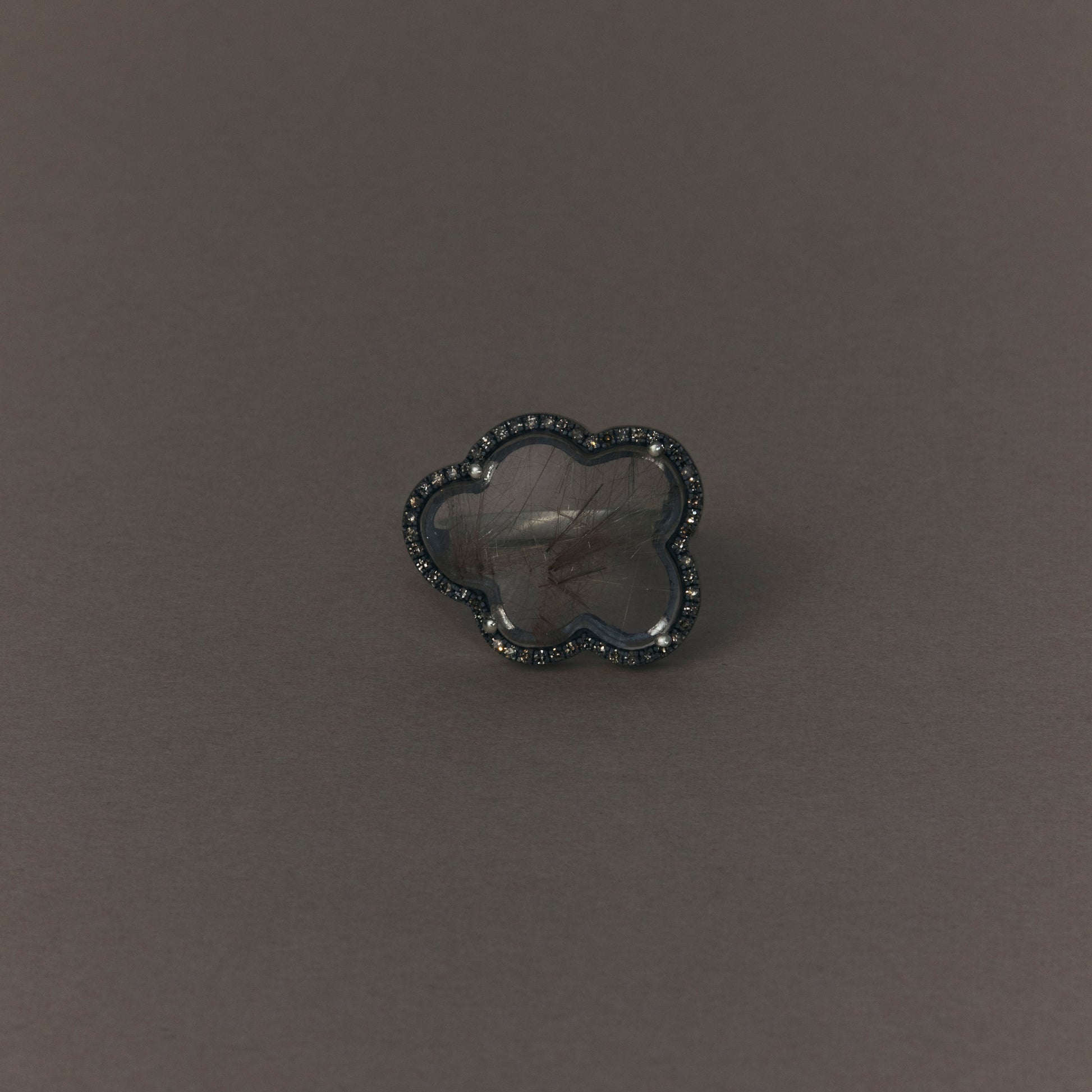長年眠っていたデッドストックのストーンを、日本国内の職人の手によりモダンなカットに擦り上げました。パヴェのブラウンダイヤモンドで取り巻き、爪部分にオキシダイズド加工をほどこすことでヴィンテージピースのような風合いに。シャープな角線のリングに成形しました。地金はリサイクルされたSilver925を使用、マットフィニッシュに柔らかな光沢を残しました。一点ものとなります。