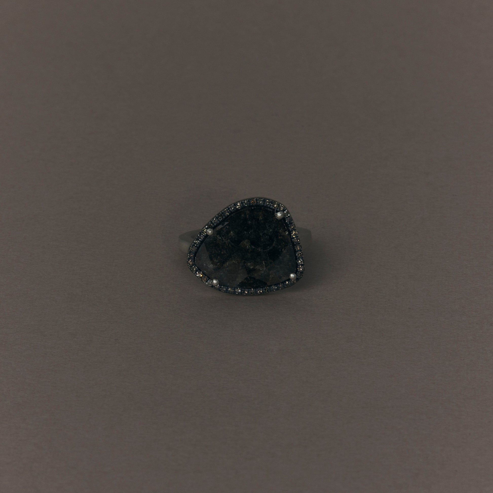 長年眠っていたデッドストックのストーンを、日本国内の職人の手によりモダンなカットに擦り上げました。パヴェのブラウンダイヤモンドで取り巻き、爪部分にオキシダイズド加工をほどこすことでヴィンテージピースのような風合いに。シャープな角線のリングに成形しました。地金はリサイクルされたSilver925を使用、マットフィニッシュに柔らかな光沢を残しました。一点ものとなります。