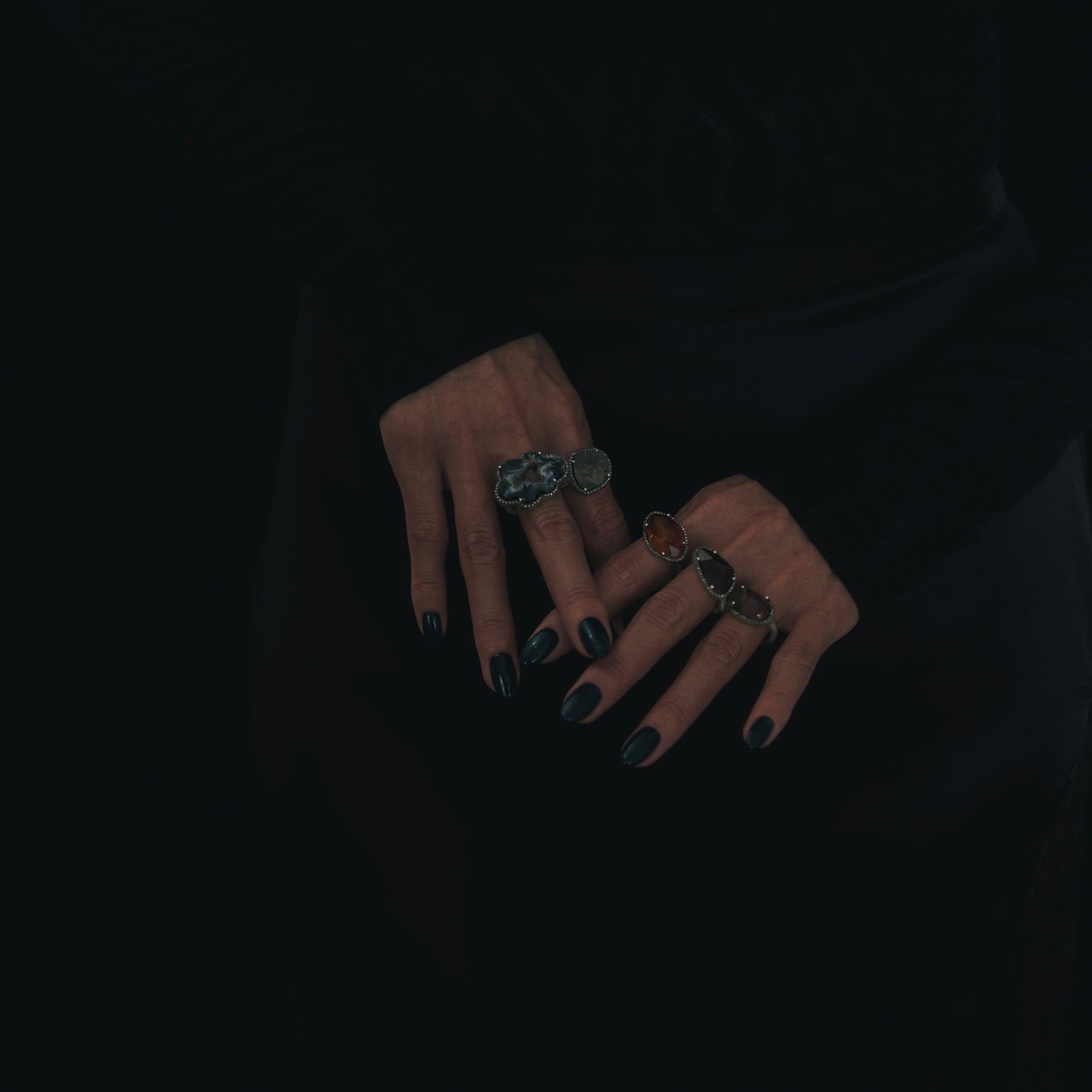 長年眠っていたデッドストックのストーンを、日本国内の職人の手によりモダンなカットに擦り上げました。パヴェのブラウンダイヤモンドで取り巻き、爪部分にオキシダイズド加工をほどこすことでヴィンテージピースのような風合いに。シャープな角線のリングに成形しました。地金はリサイクルされたSilver925を使用、マットフィニッシュに柔らかな光沢を残しました。一点ものとなります。