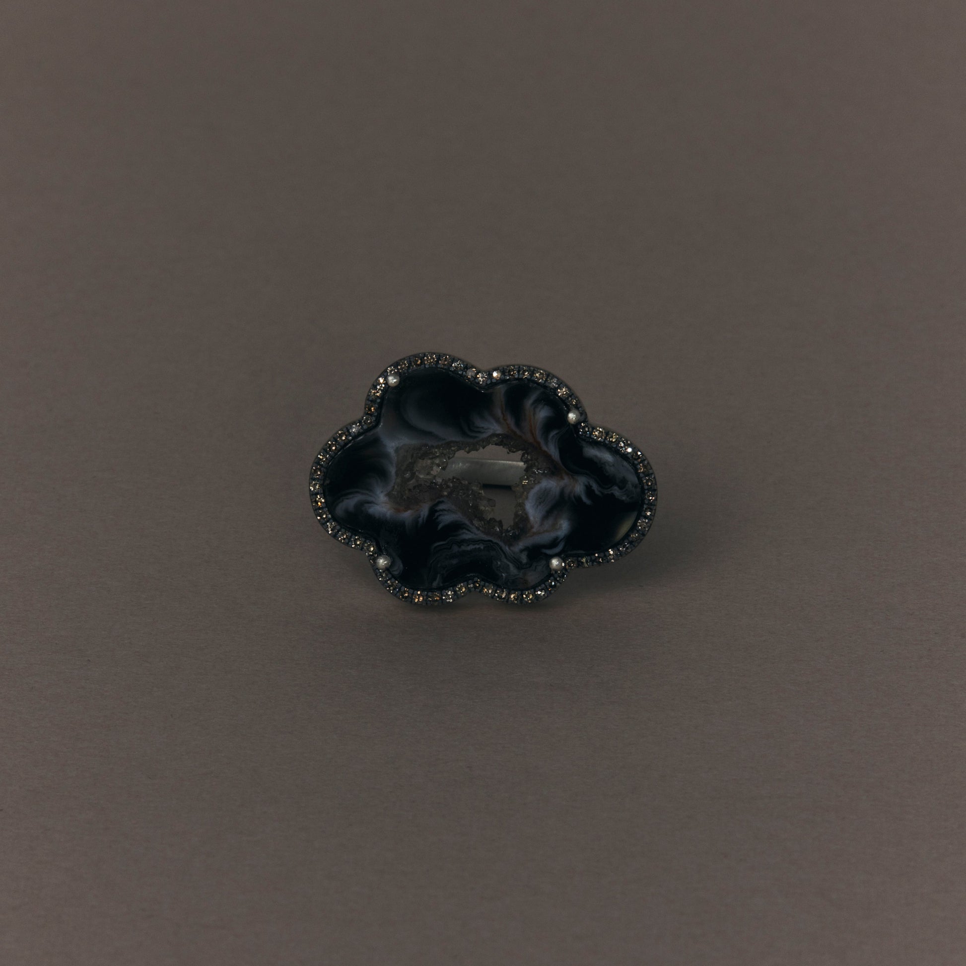 長年眠っていたデッドストックのストーンを、日本国内の職人の手によりモダンなカットに擦り上げました。パヴェのブラウンダイヤモンドで取り巻き、爪部分にオキシダイズド加工をほどこすことでヴィンテージピースのような風合いに。シャープな角線のリングに成形しました。地金はリサイクルされたSilver925を使用、マットフィニッシュに柔らかな光沢を残しました。一点ものとなります。