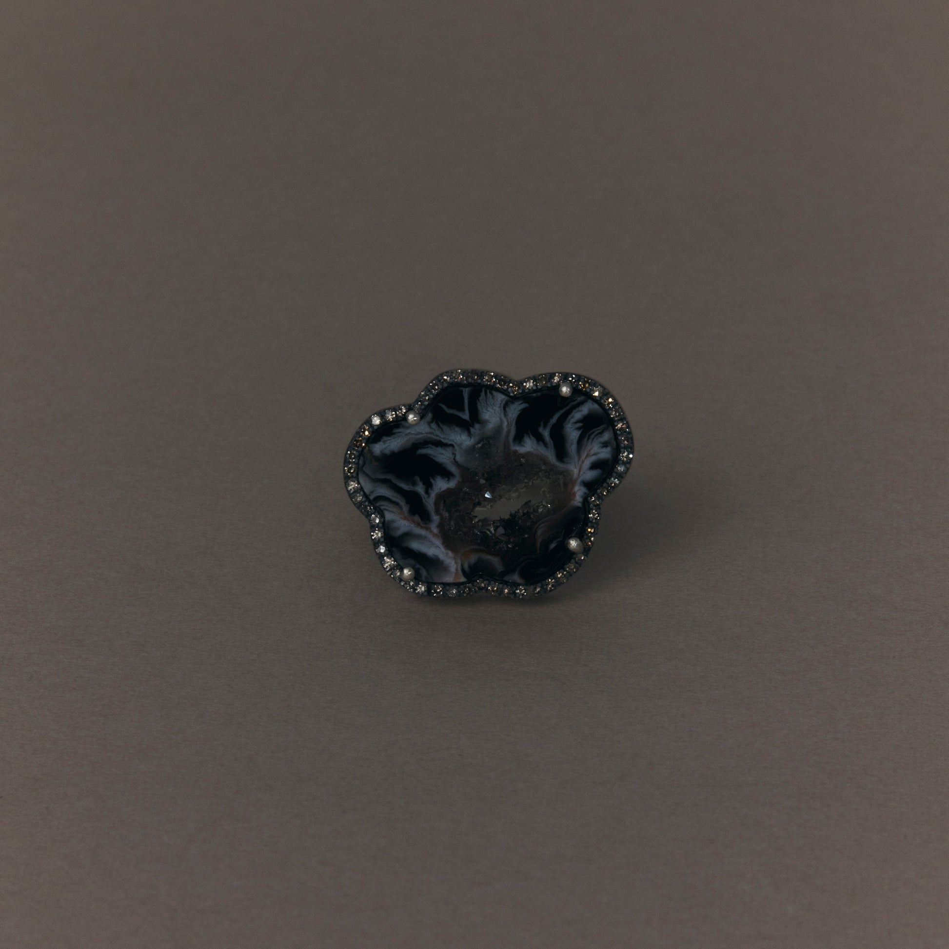 長年眠っていたデッドストックのストーンを、日本国内の職人の手によりモダンなカットに擦り上げました。パヴェのブラウンダイヤモンドで取り巻き、爪部分にオキシダイズド加工をほどこすことでヴィンテージピースのような風合いに。シャープな角線のリングに成形しました。地金はリサイクルされたSilver925を使用、マットフィニッシュに柔らかな光沢を残しました。一点ものとなります。
