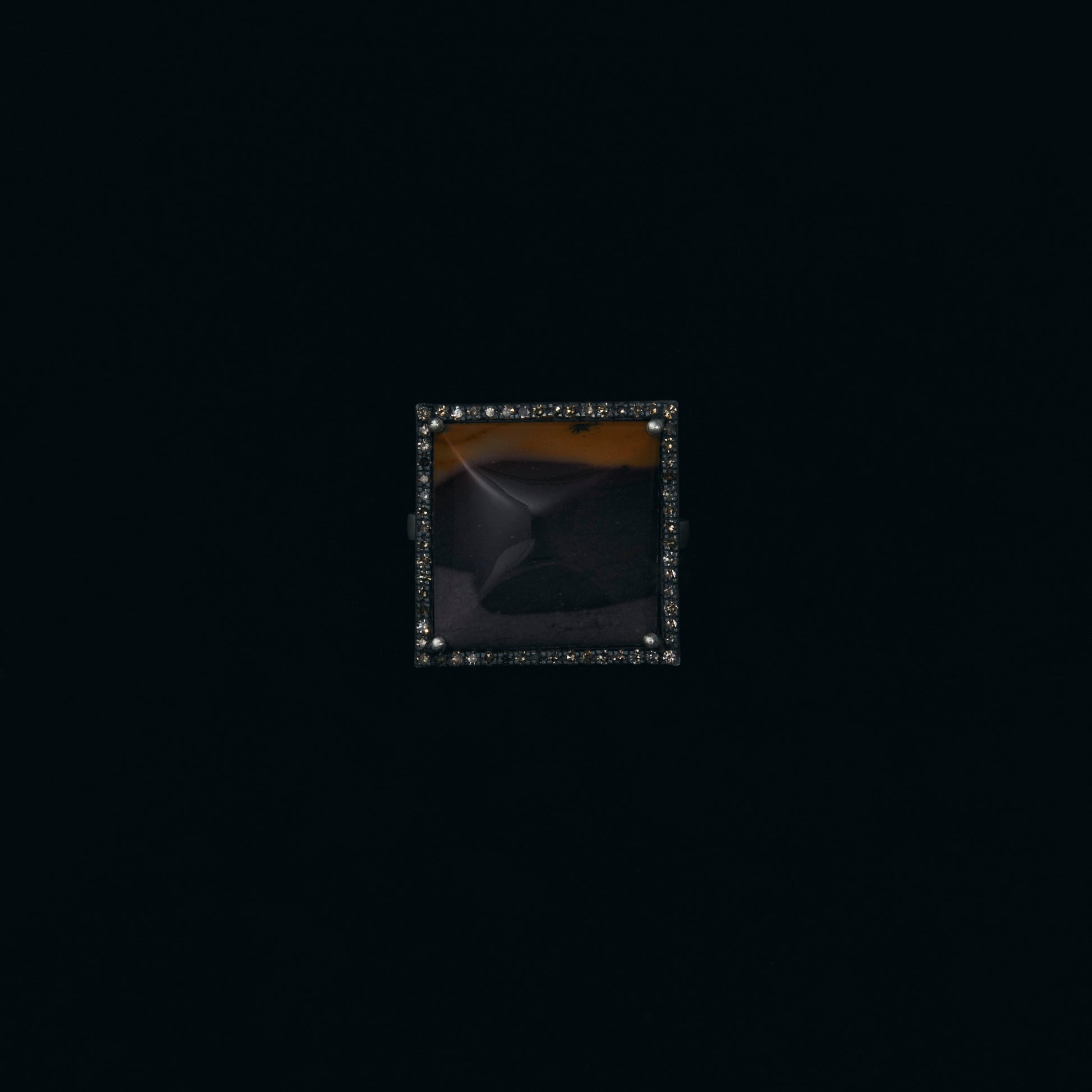 長年眠っていたデッドストックのストーンを、日本国内の職人の手によりモダンなカットに擦り上げました。パヴェのブラウンダイヤモンドで取り巻き、爪部分にオキシダイズド加工をほどこすことでヴィンテージピースのような風合いに。シャープな角線のリングに成形しました。地金はリサイクルされたSilver925を使用、マットフィニッシュに柔らかな光沢を残しました。一点ものとなります。