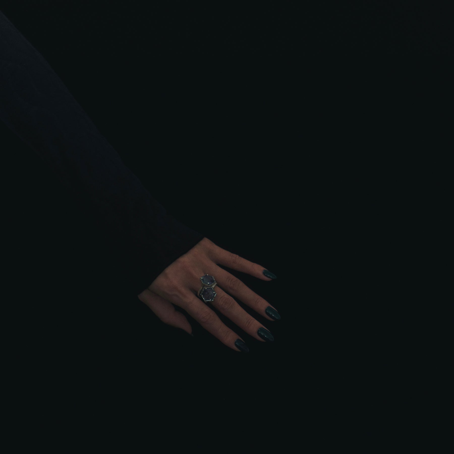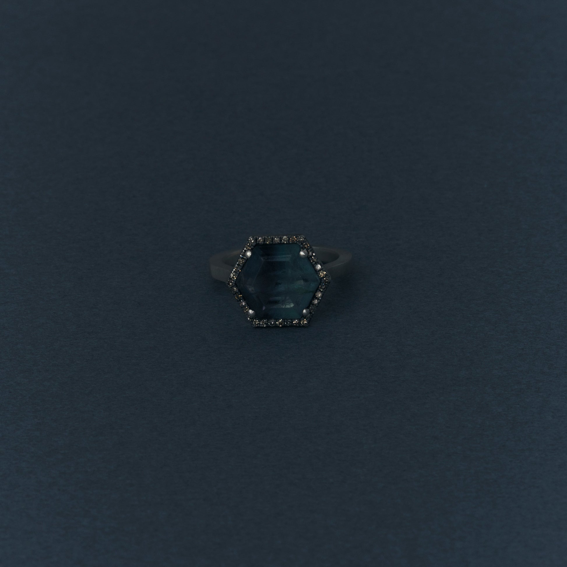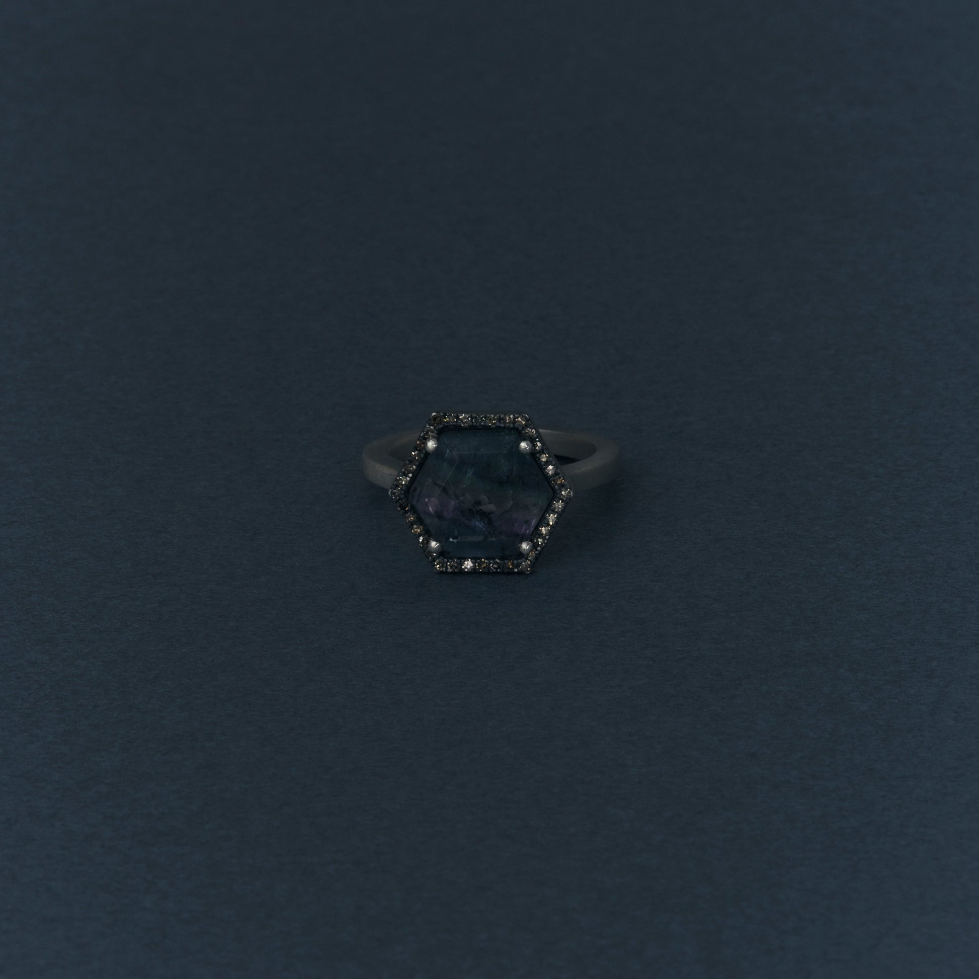 長年眠っていたデッドストックのストーンを、日本国内の職人の手によりモダンなカットに擦り上げました。パヴェのブラウンダイヤモンドで取り巻き、爪部分にオキシダイズド加工をほどこすことでヴィンテージピースのような風合いに。シャープな角線のリングに成形しました。地金はリサイクルされたSilver925を使用、マットフィニッシュに柔らかな光沢を残しました。一点ものとなります。