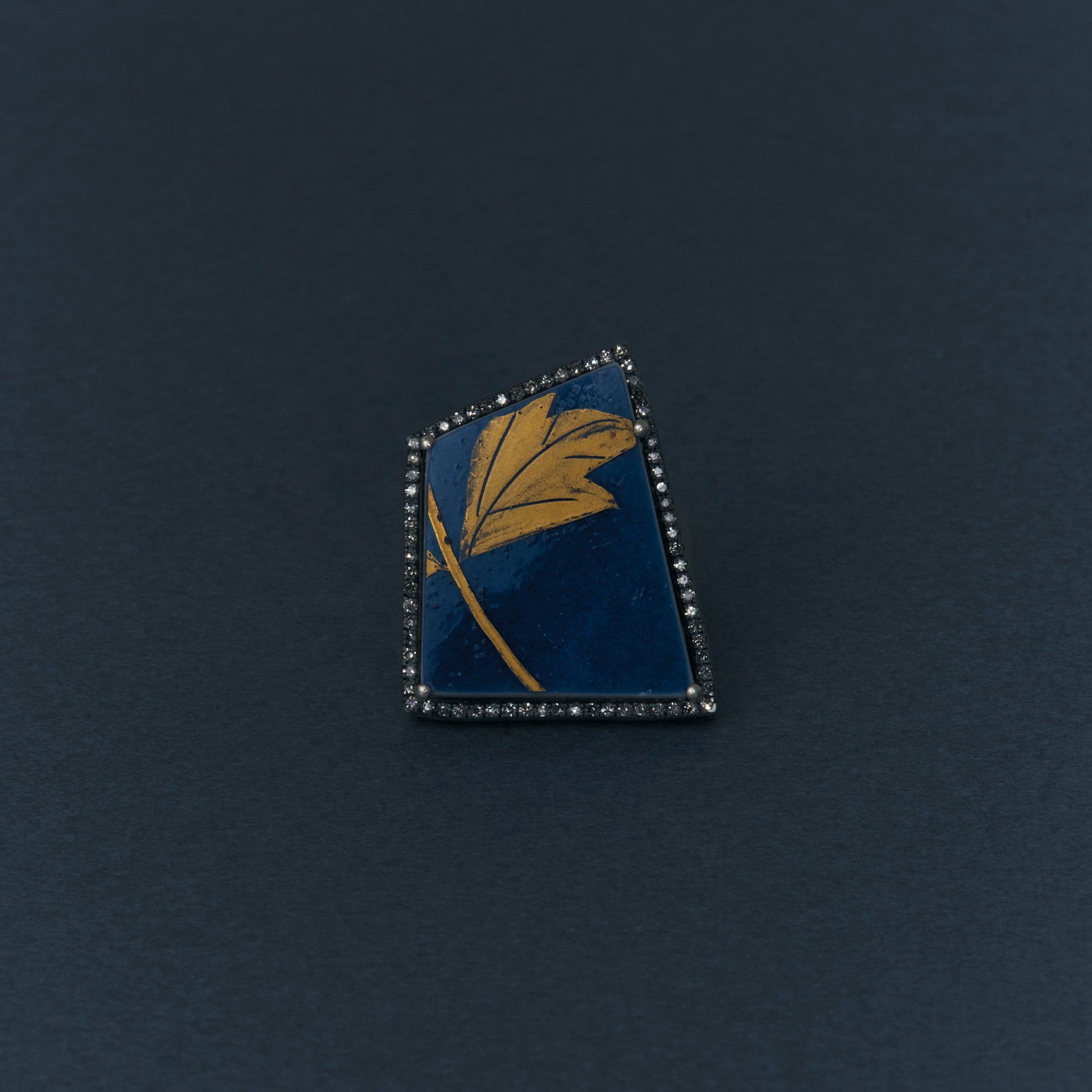 Adlin Hueは、その金彩の美しい欠片を小さくカットし、角を丁寧に磨き上げ、“ひとつの宝石”としてリングにセッティング。パヴェダイヤモンドで取り巻き、爪部分にオキシダイズド加工をほどこすことでヴィンテージピースのような風合いに。
