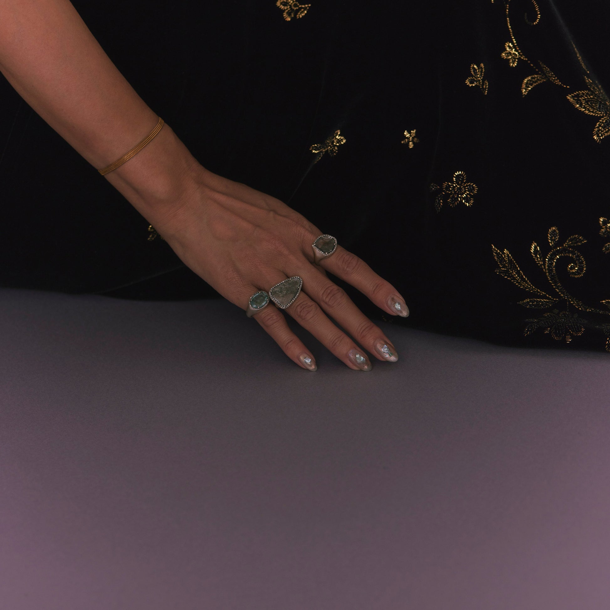 長年眠っていたデッドストックのストーンを、日本国内の職人の手によりモダンなカットに擦り上げました。パヴェダイヤモンドで取り巻き、爪部分にオキシダイズド加工をほどこすことでヴィンテージピースのような風合いに。丸みを帯びたボリュームシェイプのリングに成形しました。地金はリサイクルされたSilver925を使用、マットフィニッシュに柔らかな光沢を残しました。一点ものとなります。