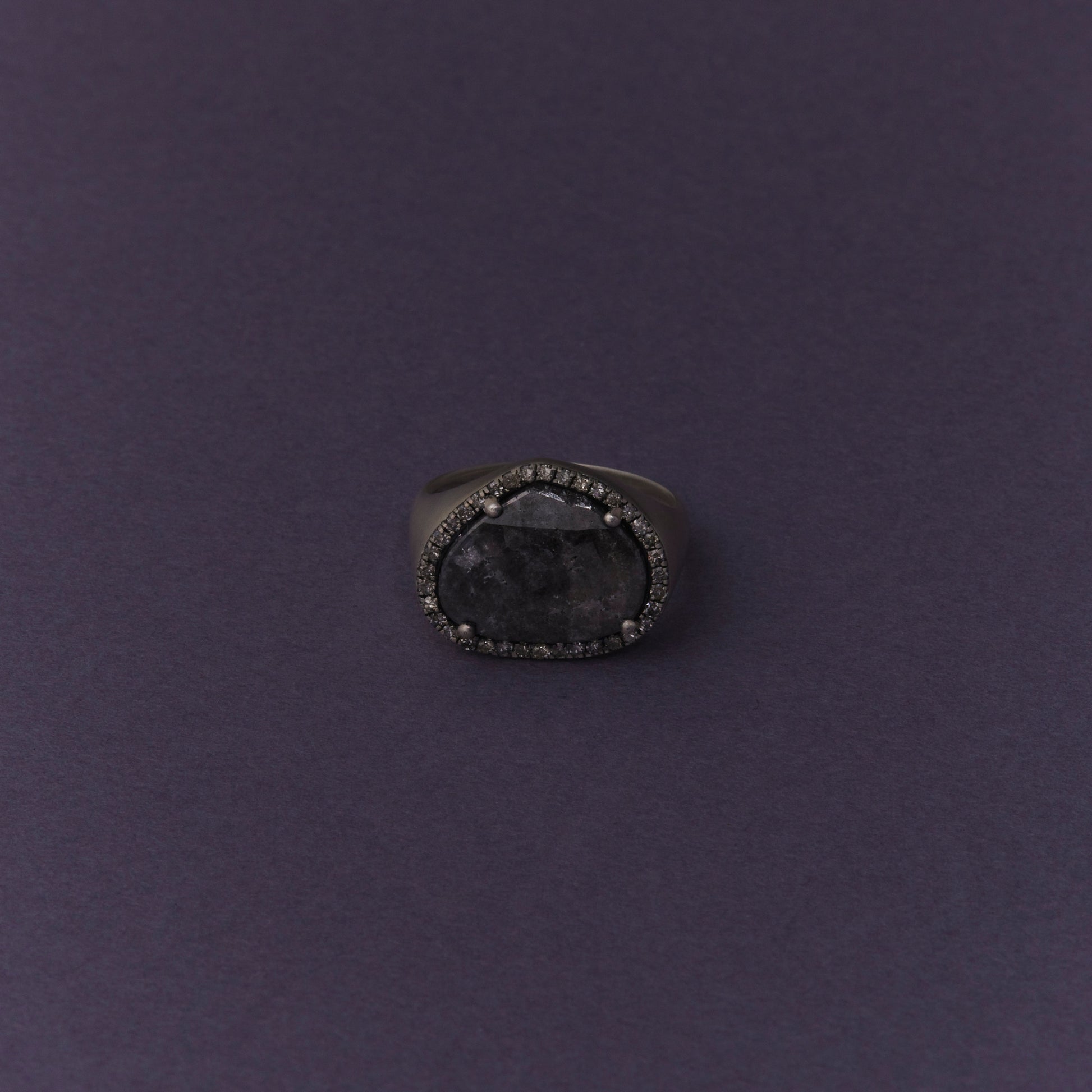 長年眠っていたデッドストックのストーンを、日本国内の職人の手によりモダンなカットに擦り上げました。パヴェダイヤモンドで取り巻き、爪部分にオキシダイズド加工をほどこすことでヴィンテージピースのような風合いに。丸みを帯びたボリュームシェイプのリングに成形しました。地金はリサイクルされたSilver925を使用、マットフィニッシュに柔らかな光沢を残しました。一点ものとなります。