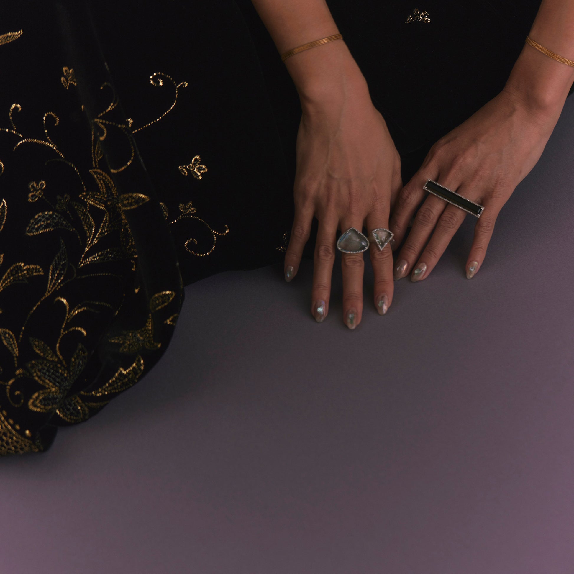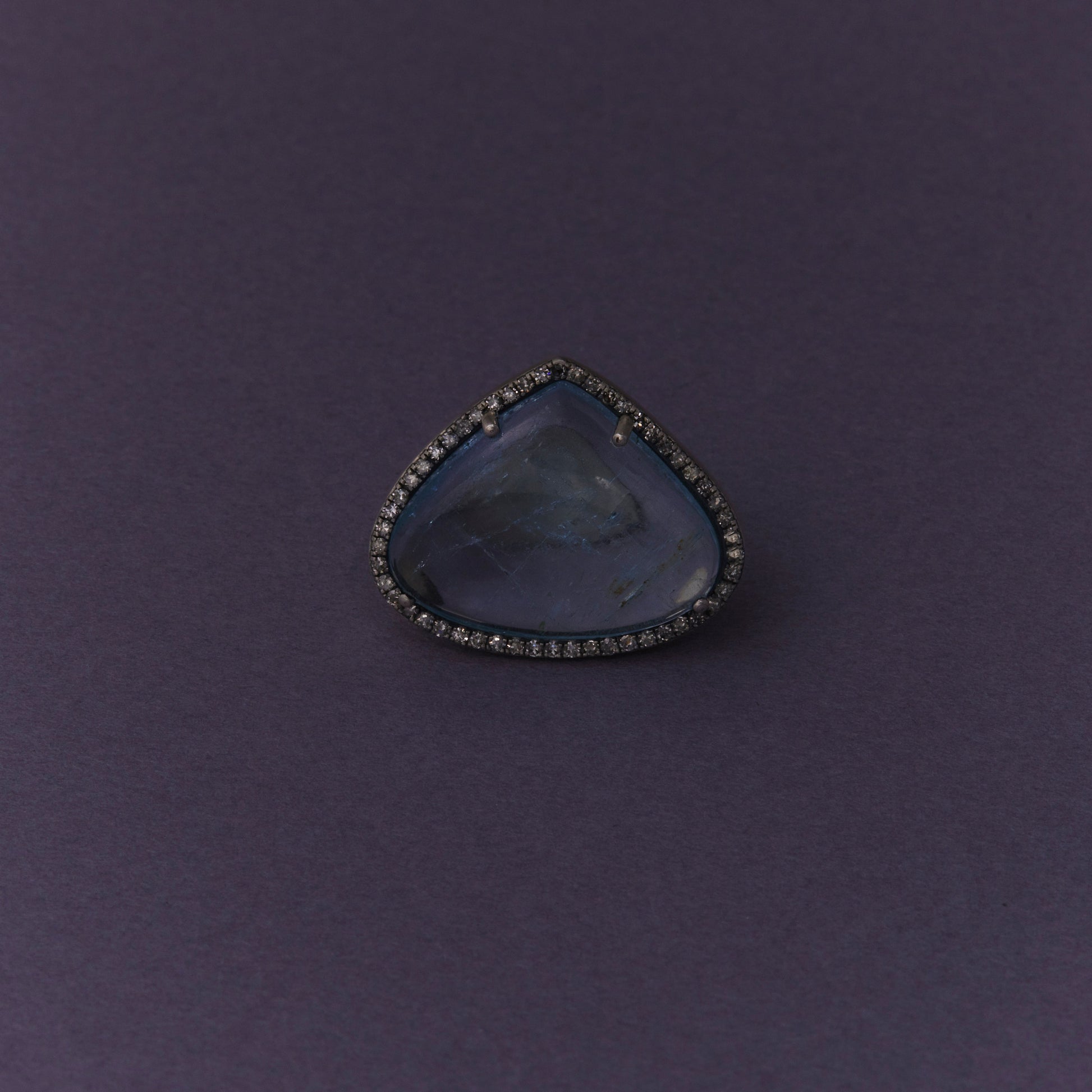 長年眠っていたデッドストックのストーンを、日本国内の職人の手によりモダンなカットに擦り上げました。パヴェダイヤモンドで取り巻き、爪部分にオキシダイズド加工をほどこすことでヴィンテージピースのような風合いに。丸みを帯びたボリュームシェイプのリングに成形しました。地金はリサイクルされたSilver925を使用、マットフィニッシュに柔らかな光沢を残しました。一点ものとなります。