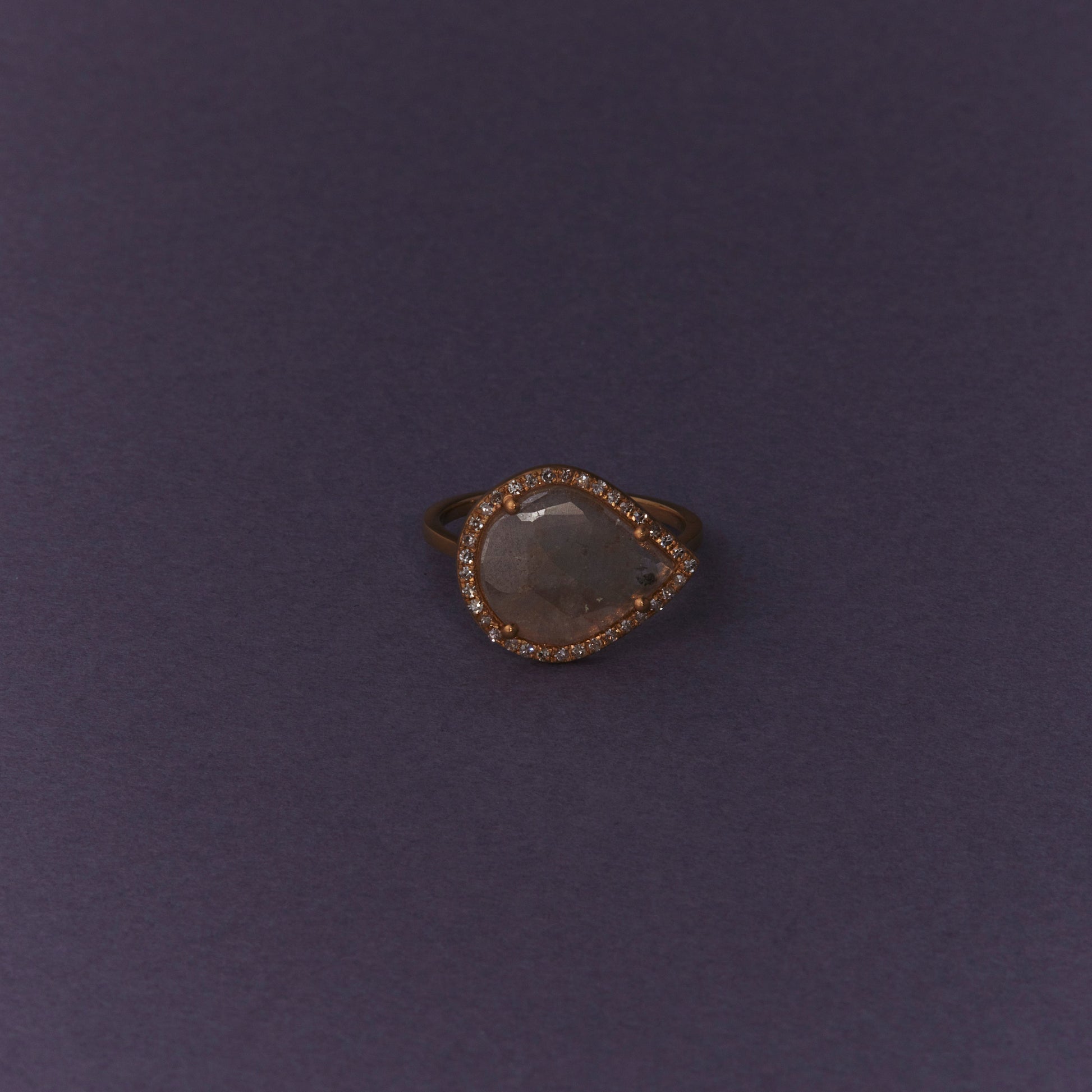 柔らかな輝きを放つスライスダイヤモンドをパヴェダイヤモンドで取り巻き、K18YGの繊細なリングにセッティングしました。一点ものとなります。