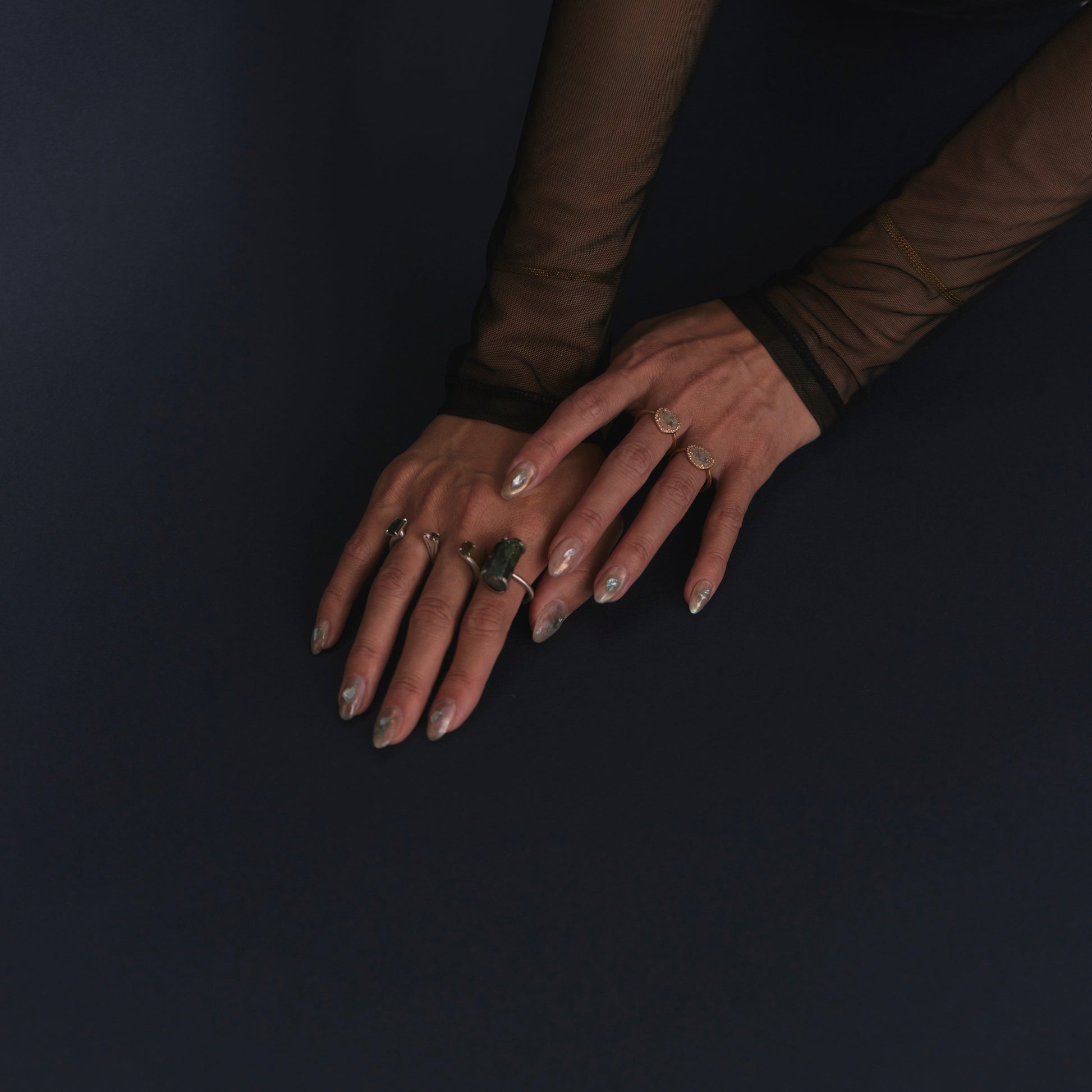 柔らかな輝きを放つスライスダイヤモンドをパヴェダイヤモンドで取り巻き、K18YGの繊細なリングにセッティングしました。一点ものとなります。
