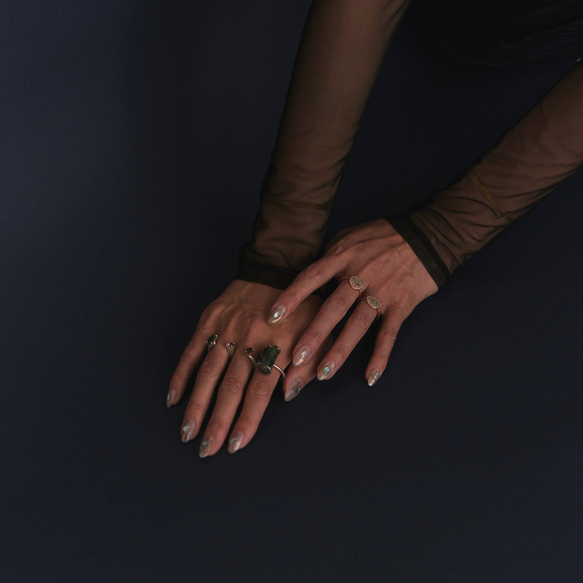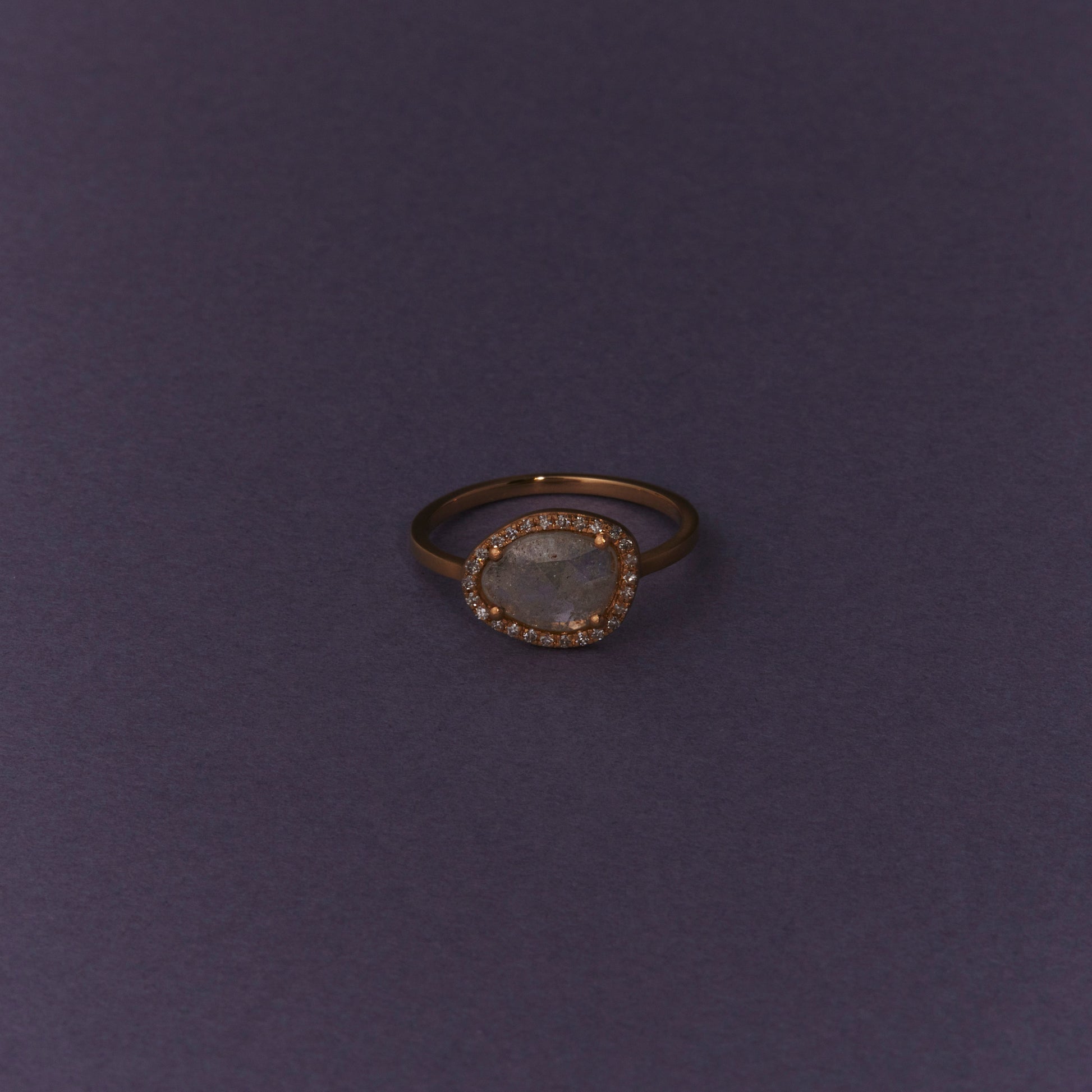 柔らかな輝きを放つスライスダイヤモンドをパヴェダイヤモンドで取り巻き、K18YGの繊細なリングにセッティングしました。一点ものとなります。
