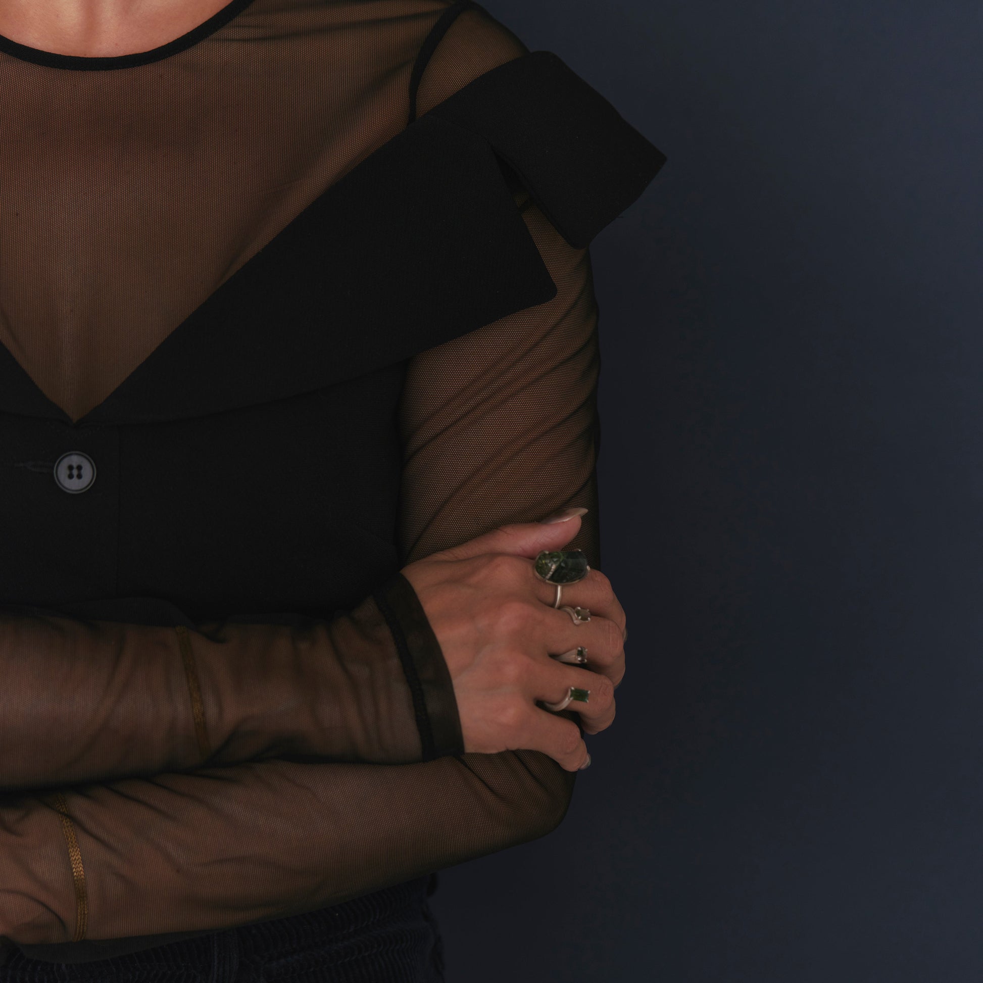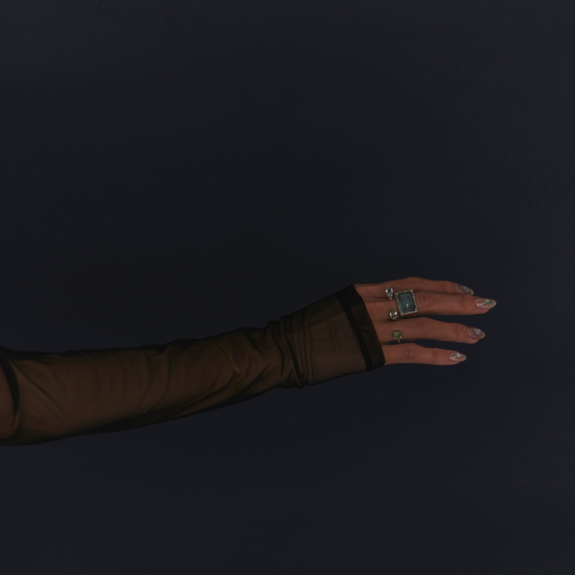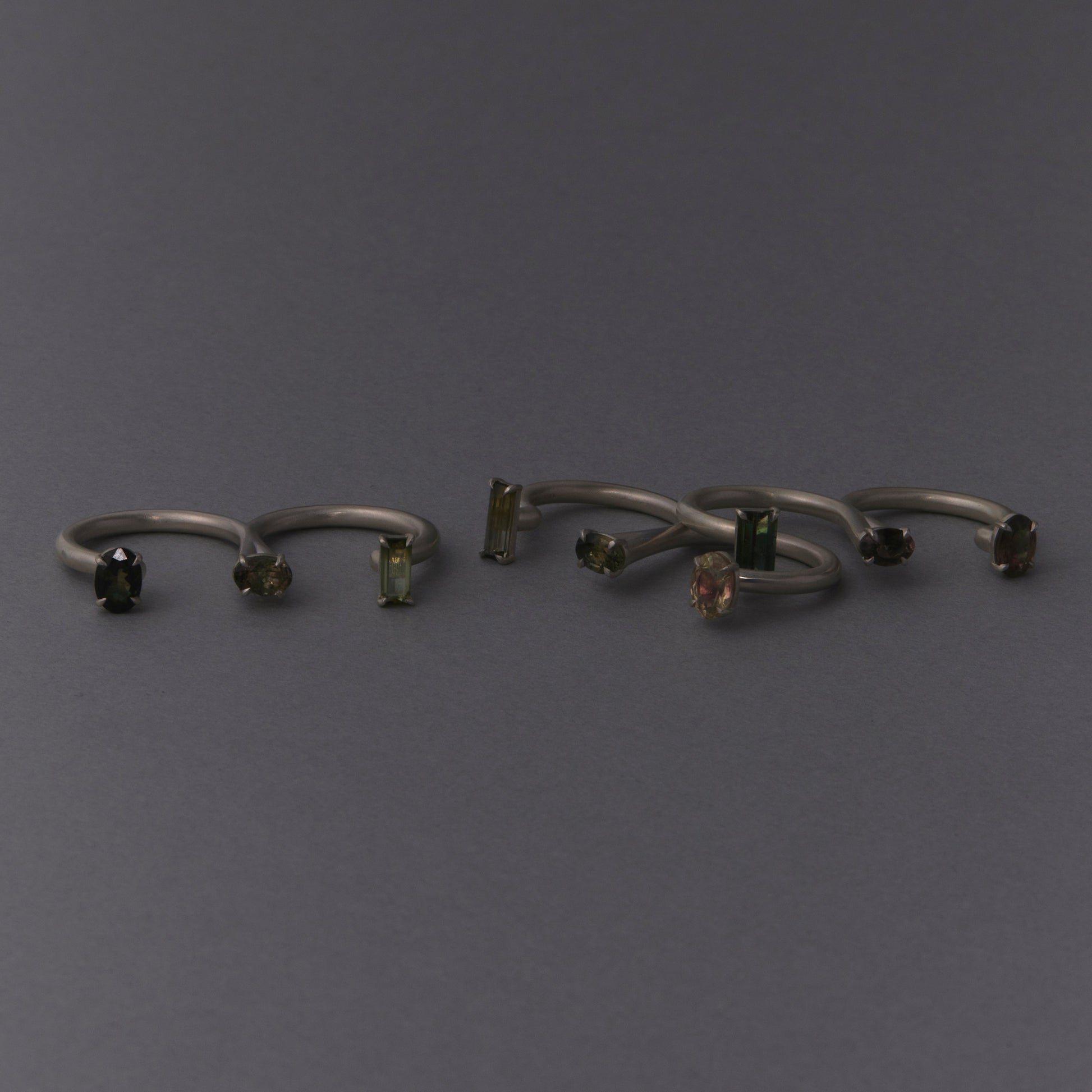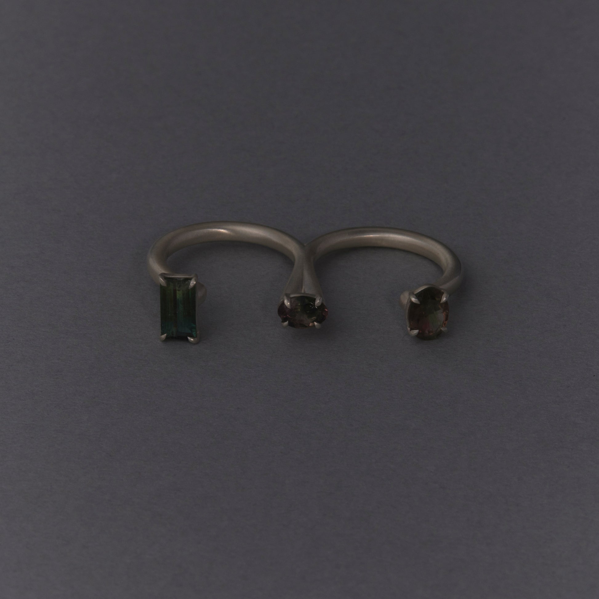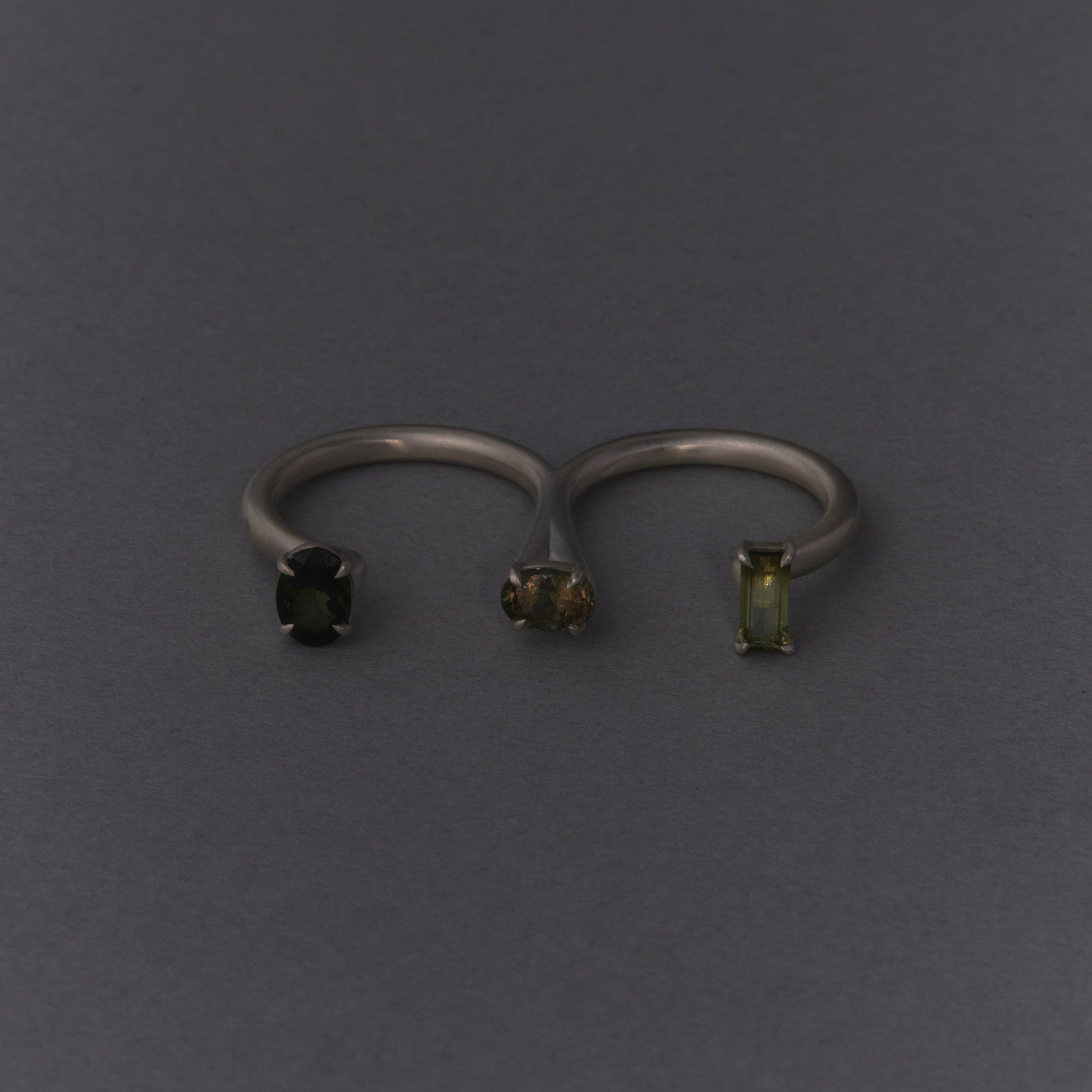 長年眠っていたデッドストックのストーンを使用しています。オーバルとレクタングルのグリーントルマリンを配したダブルフィンガーリング。地金はリサイクルされたSilver925を使用、マットフィニッシュに柔らかな光沢を残しました。