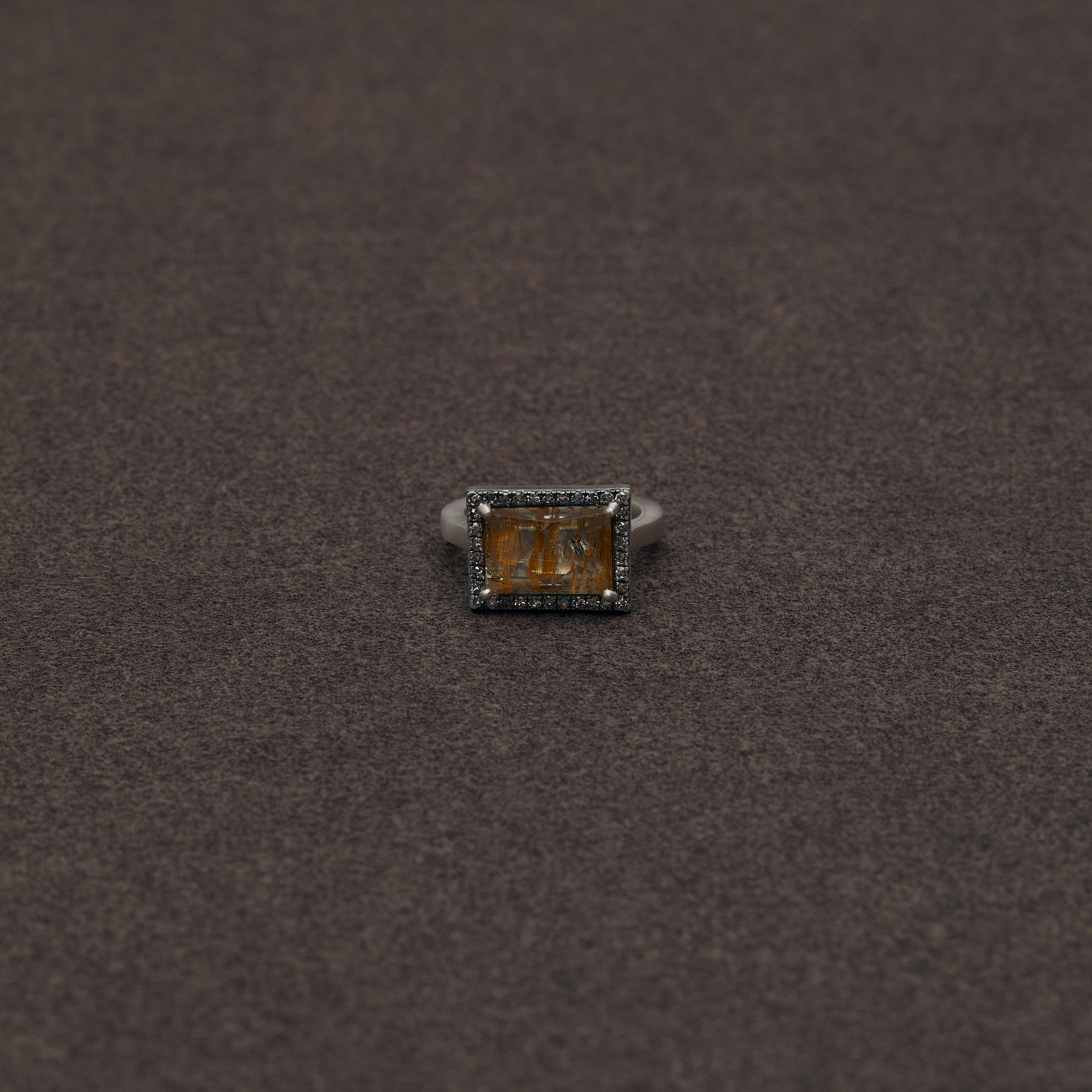 A deadstock stone that had been lying dormant for many years has been polished by artisans in Japan into a modern cut. It is surrounded by pave brown diamonds and the prongs are oxidized to give it a vintage look. It is shaped into a sharp, rectangular ring. The base metal is recycled Silver 925, with a matte finish that leaves a soft luster. This is a one-of-a-kind piece.