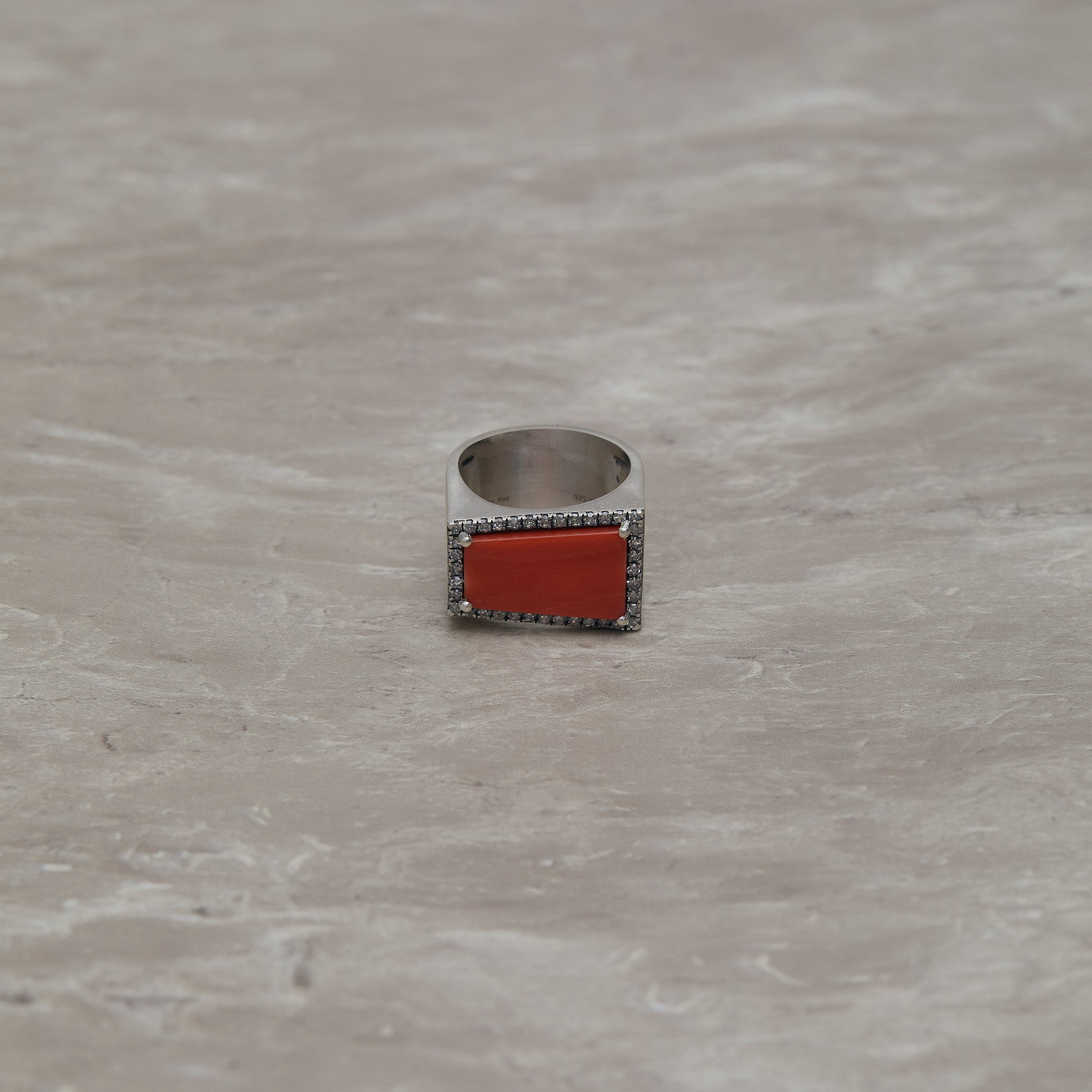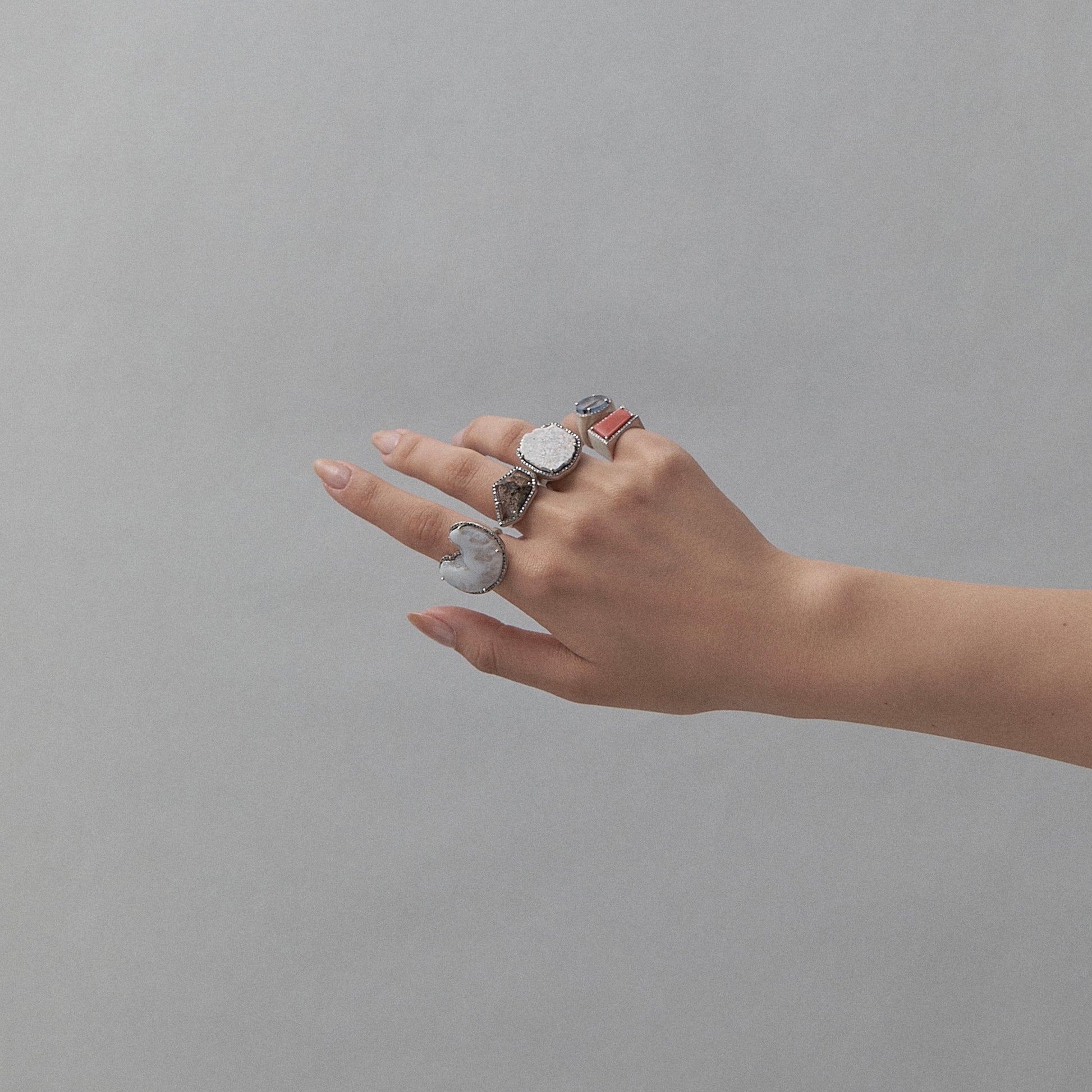 A deadstock stone that had been lying dormant for many years has been polished by artisans in Japan into a modern cut. It is surrounded by pavé diamonds and the prongs are oxidized to give it a vintage look. It is shaped into a voluminous wide band ring. The base metal is recycled Silver 925, with a matte finish that leaves a soft luster. This is a one-of-a-kind piece.