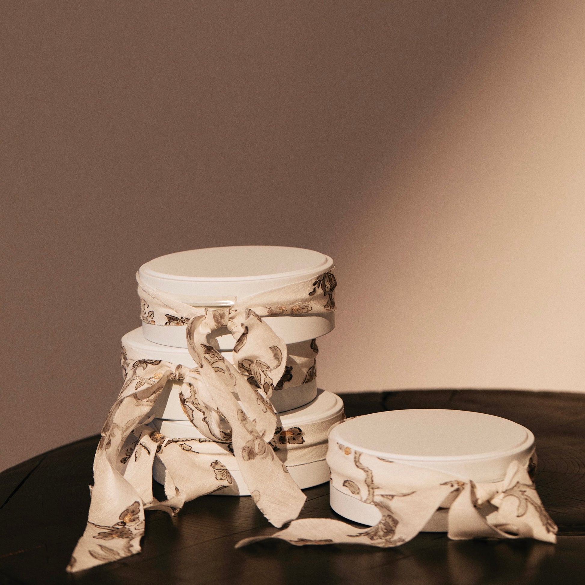 The cotton silk ribbon wrapped around the pure white can is also by Craft Boat. It features a block print of plants and butterflies dotted with gold and silver foil.