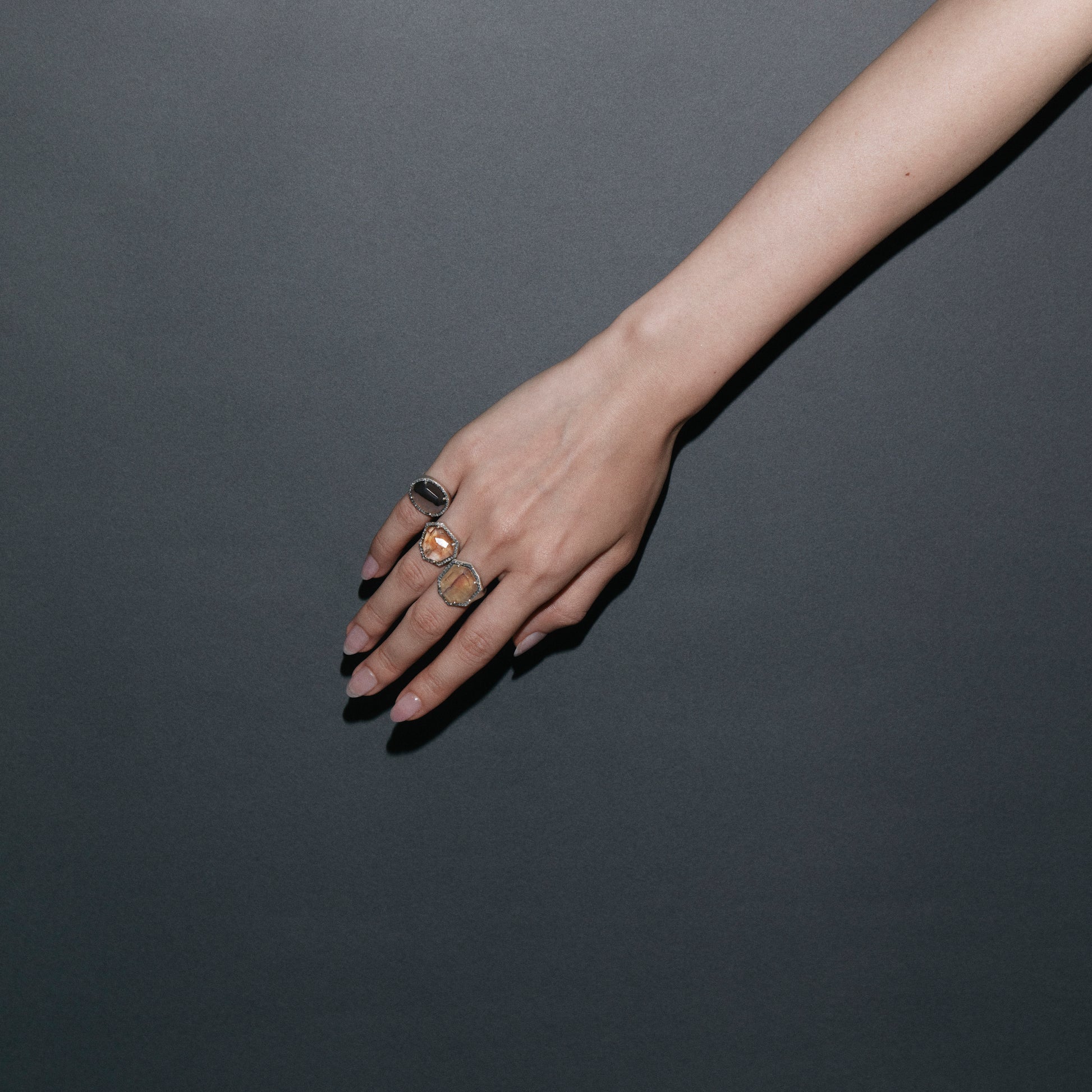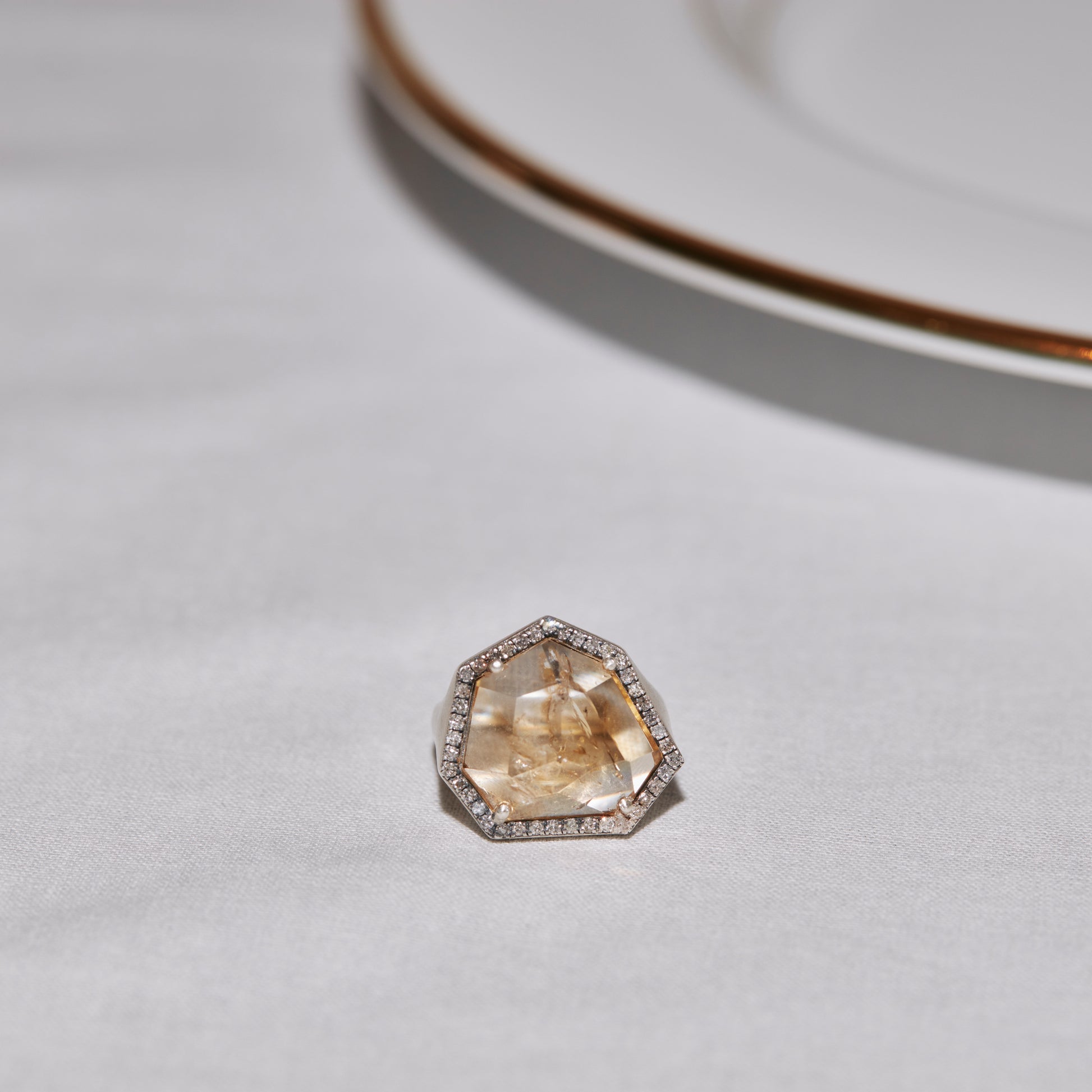 長年眠っていたデッドストックのストーンを、日本国内の職人の手によりモダンなカットに擦り上げました。パヴェダイヤモンドで取り巻き、爪部分にオキシダイズド加工をほどこすことでヴィンテージピースのような風合いに。丸みを帯びたボリュームシェイプのリングに成形しました。地金はリサイクルされたSilver925を使用、マットフィニッシュに柔らかな光沢を残しました。一点ものとなります。