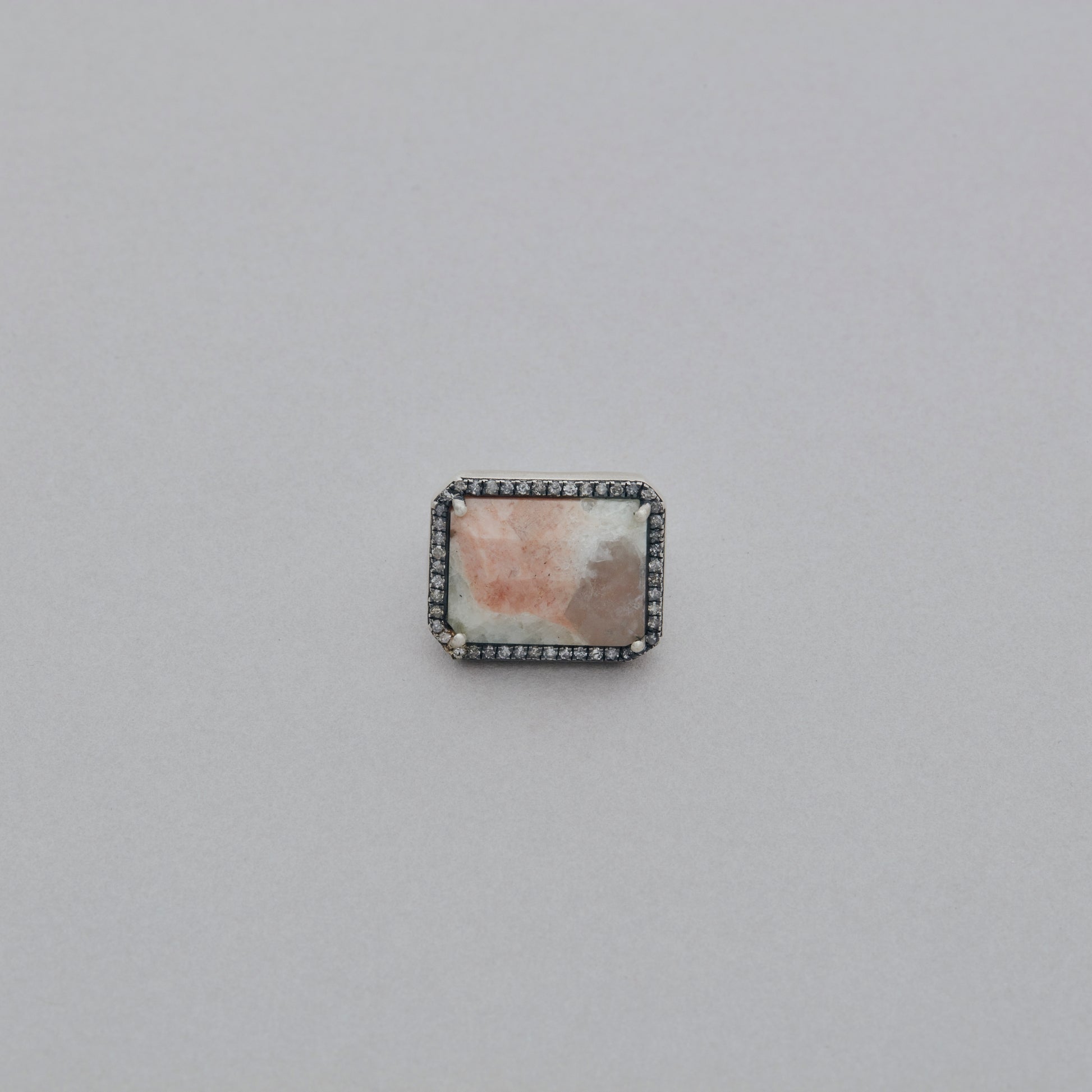 長年眠っていたデッドストックのストーンを、日本国内の職人の手によりモダンなカットに擦り上げました。パヴェダイヤモンドで取り巻き、爪部分にオキシダイズド加工をほどこすことでヴィンテージピースのような風合いに。丸みを帯びたボリュームシェイプのリングに成形しました。地金はリサイクルされたSilver925を使用、マットフィニッシュに柔らかな光沢を残しました。一点ものとなります。