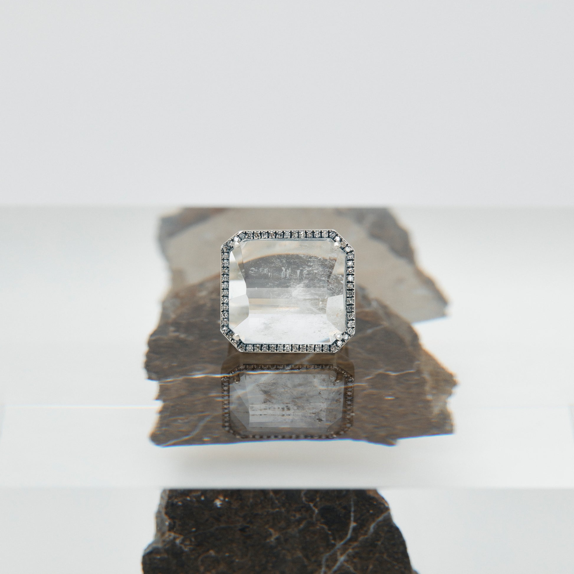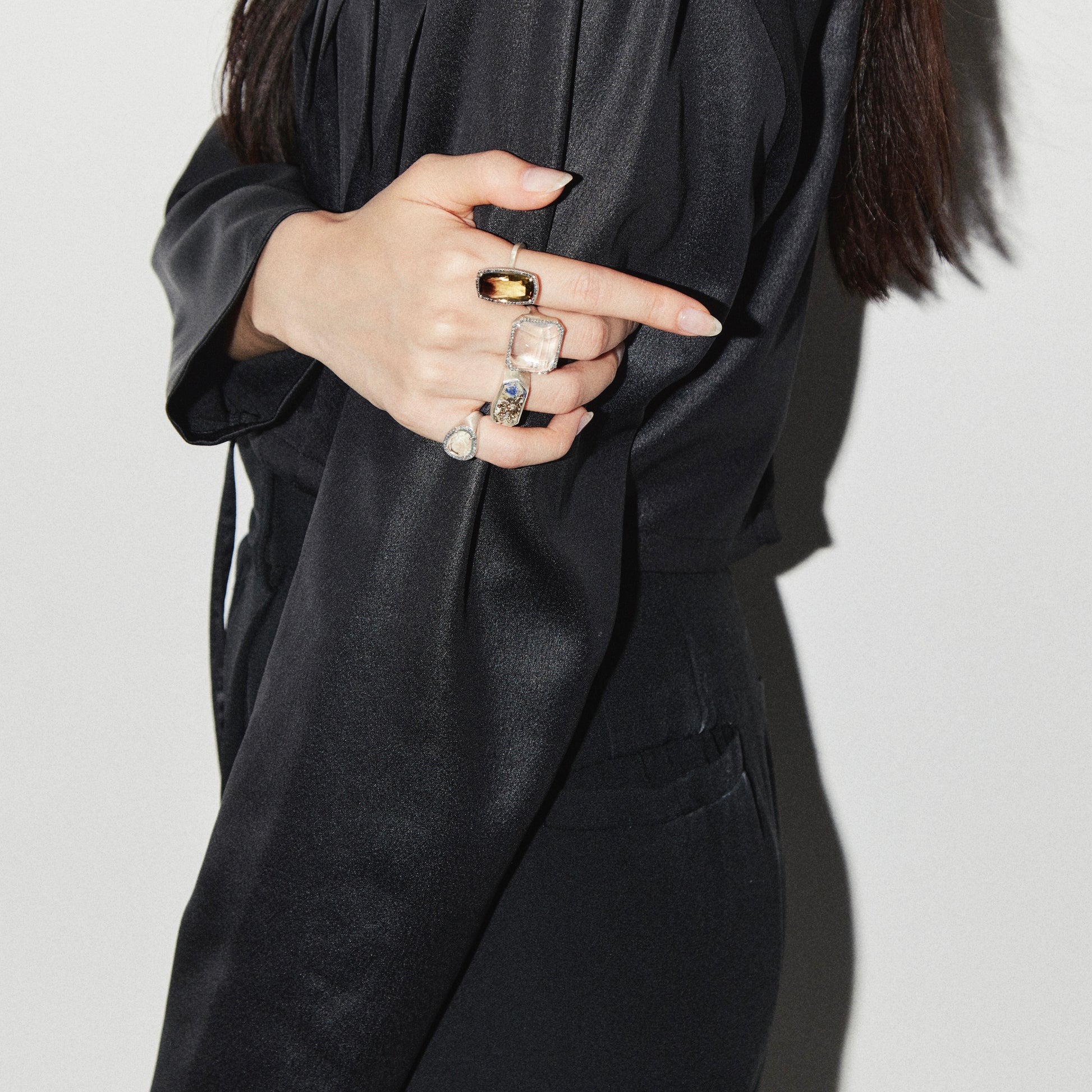 長年眠っていたデッドストックのストーンを、日本国内の職人の手によりモダンなカットに擦り上げました。パヴェダイヤモンドで取り巻き、爪部分にオキシダイズド加工をほどこすことでヴィンテージピースのような風合いに。丸みを帯びたボリュームシェイプのリングに成形しました。地金はリサイクルされたSilver925を使用、マットフィニッシュに柔らかな光沢を残しました。一点ものとなります。