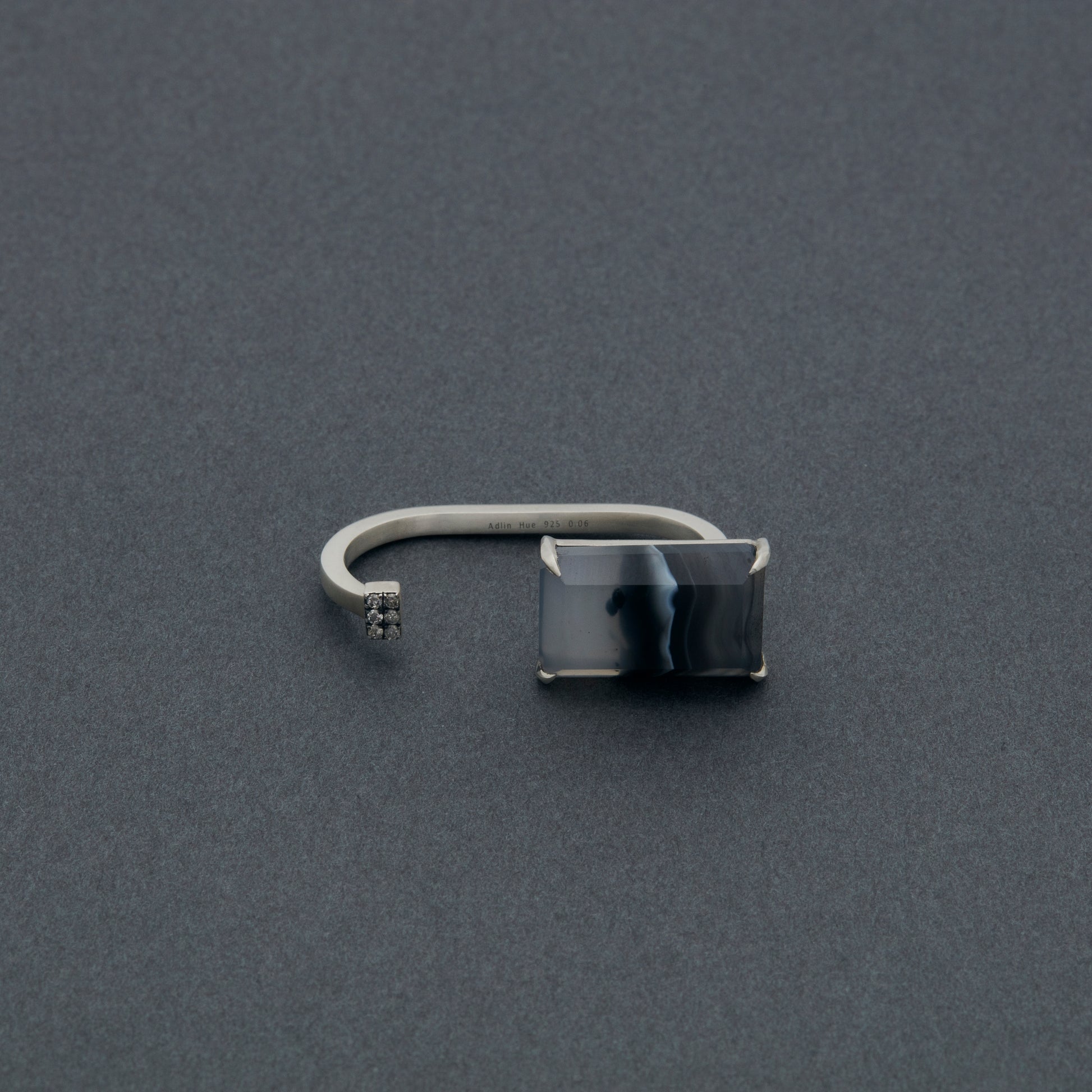 長年眠っていたデッドストックのストーンを、日本国内の職人の手によりモダンなカットに擦り上げました。爪留めした石の対極にパヴェダイヤモンドのパーツを配し、モダンな角線で繋いだダブルリング。地金はリサイクルされたSilver925を使用、マットフィニッシュに柔らかな光沢を残しました。一点ものとなります。